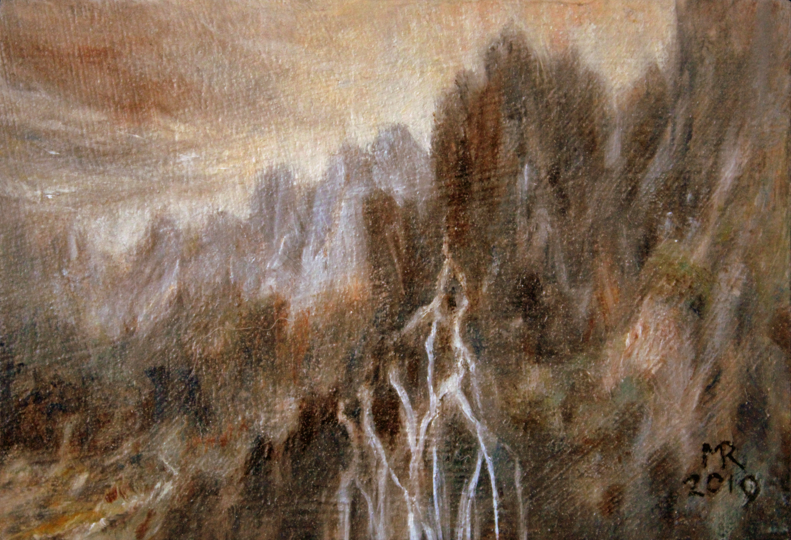 Uit de serie “Droomlandschapjes” : Een fantasie schilderijtje(olieverf/paneel), ontstaan uit een abstract vlekkenpatroon waarbij het voor mij ook altijd een verrassing is wat eruit komt. Inclusief de lijst zijn de maten 13,5 x 17,5 cm.