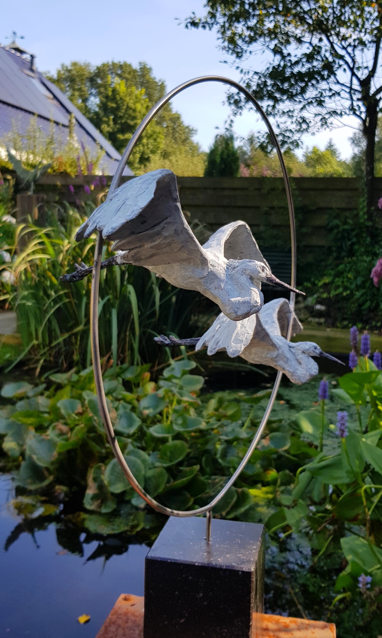 Koppel grote zilverreigers in hun vlucht. Prachtige, bijna exotische vogels die we steeds meer tegenkomen in onze landerijen. Gemonteerd in een RVS frame op een sokkel naar keuze. Het witte patina moet onderhouden worden met krijtwas. Op verzoek gegoten!!