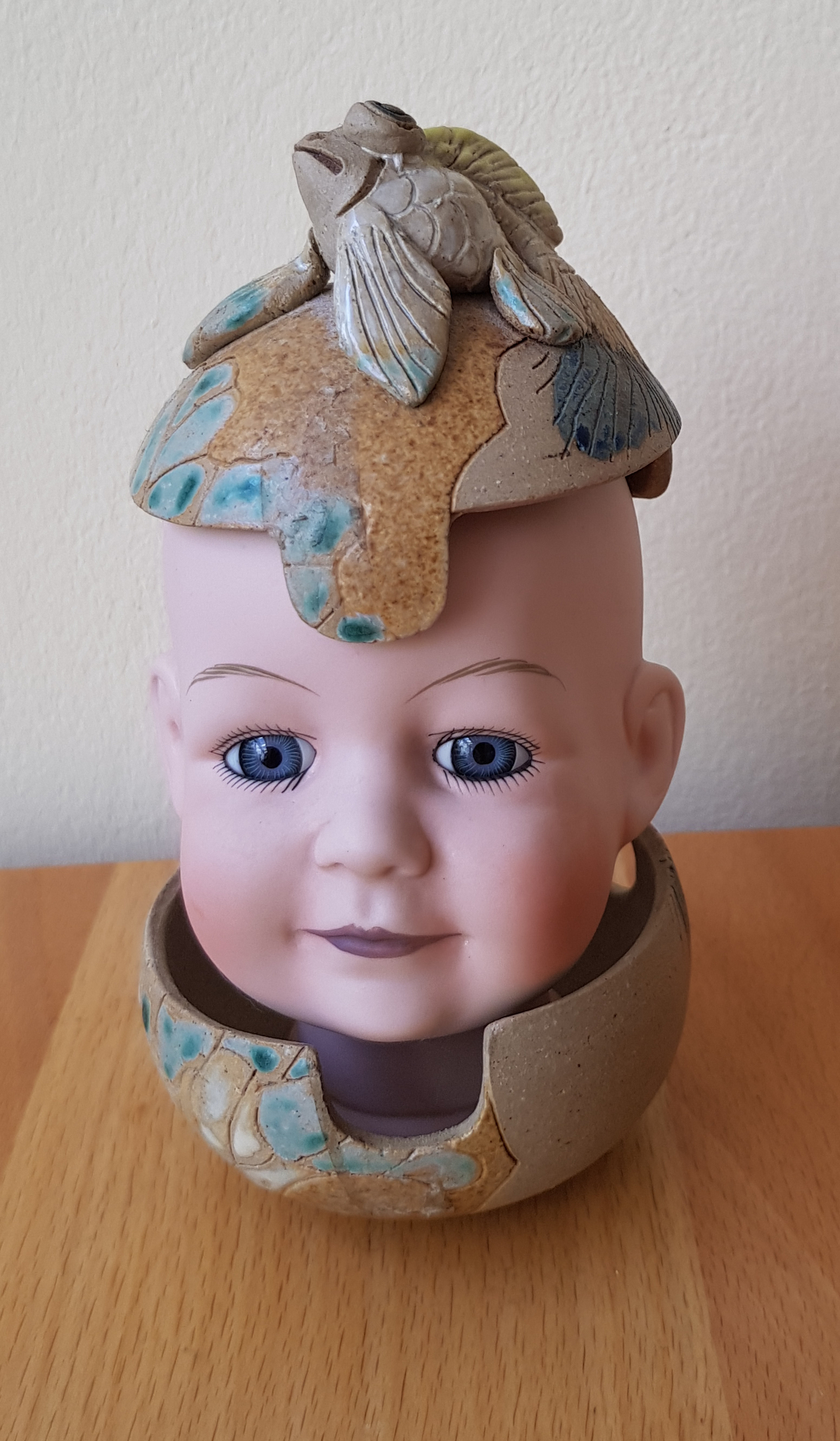 Een keramieken doosje. het porseleinen poppenhoofdje rust op de bodem, de deksel is de muts. Daar ga je visserslatijn van spreken!