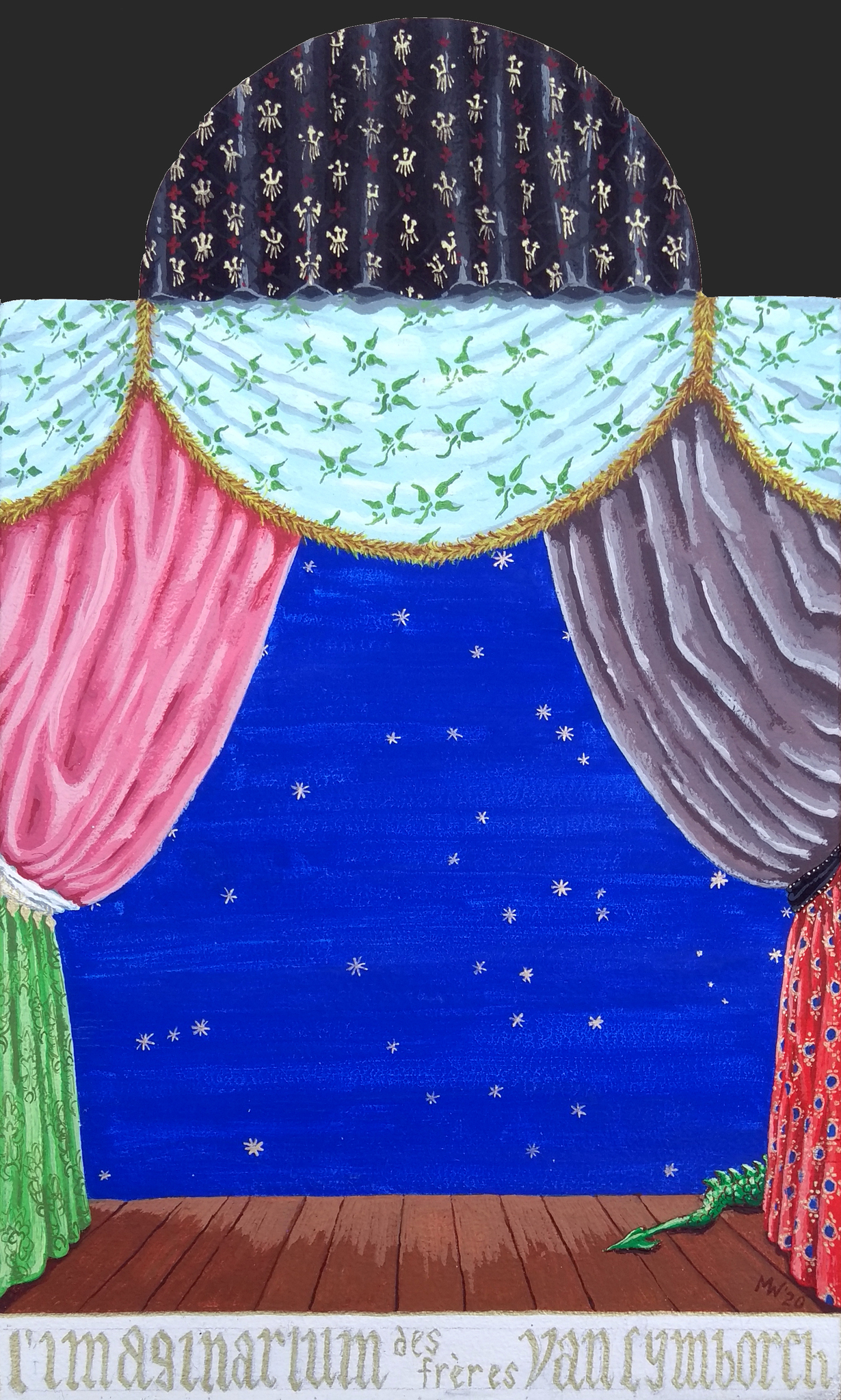 Een leeg podium... Ruimte om op te vullen met uw verbeeldingskracht. De toneelgordijnen wijzen u alvast de weg door ruimte en tijd naar het schilderwerk van de middeleeuwse Gebroeders van Lymborch. Hoewel...leeg?! Gouache (gevernist) op triplex.