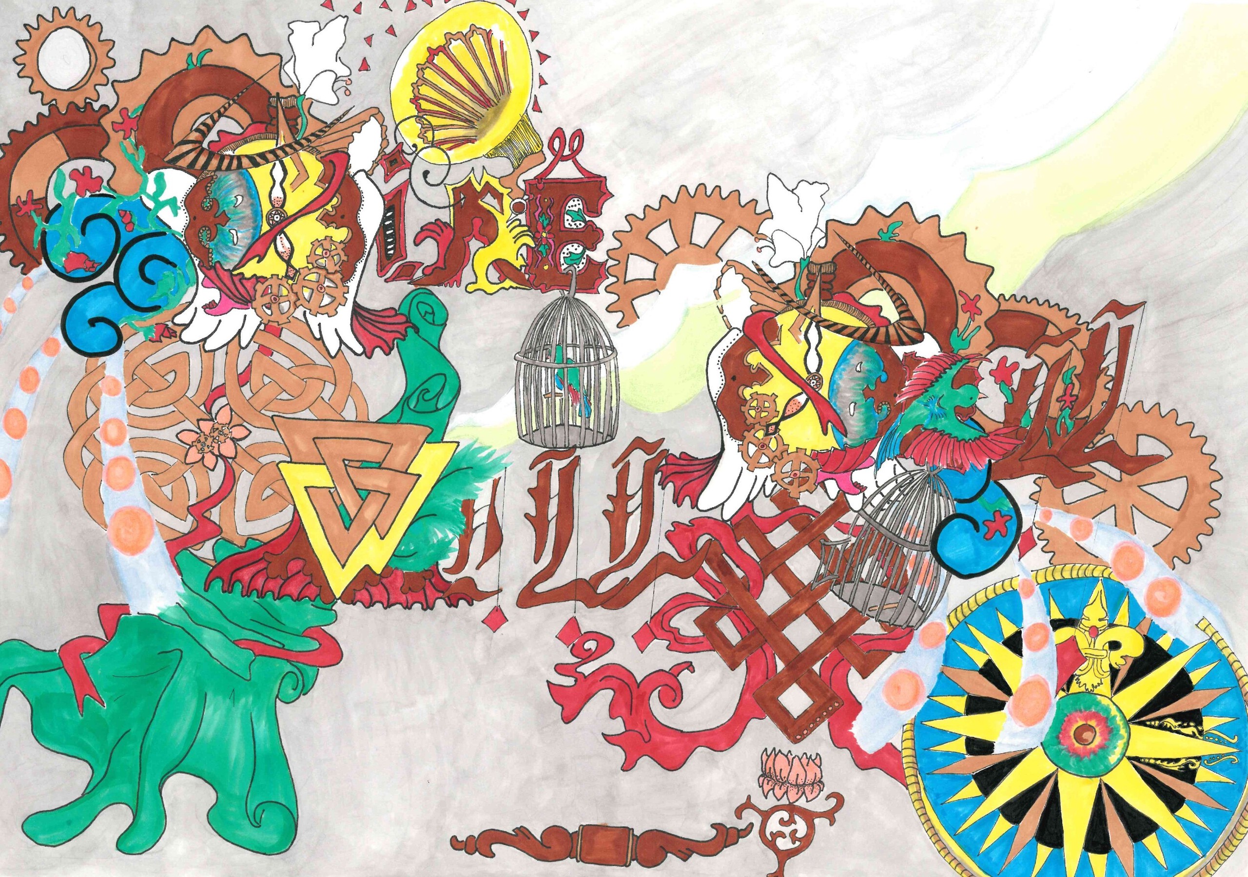 Dit kunstwerk staat voor het proces van loslaten. Het oog aan de linkerkant representeert de blik op het verleden, terwijl het oog aan de rechterkant gericht is op de toekomst. Het kompas symboliseert het vermogen om obstakels te overwinnen. De diepere betekenis van dit motief ligt in de symbolische reis die we allemaal maken om onze eigen plek in de wereld te vinden. Neem de tijd om verdere symboliek in dit schilderij te ontdekken.