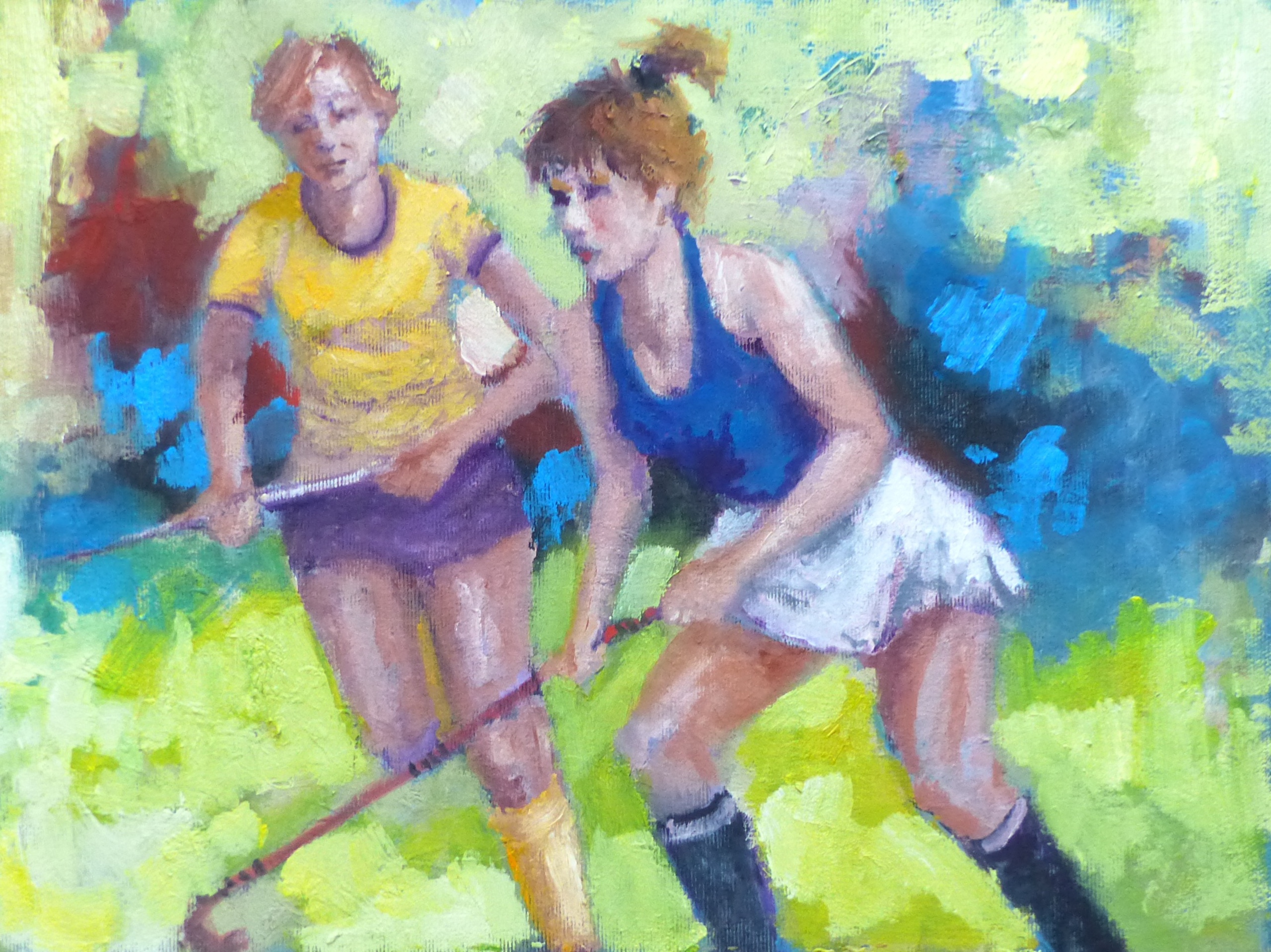 “Hockey” gesigneerd , origineel. geschilderd met olieverf op canvasboard van 30 x 40 cm.