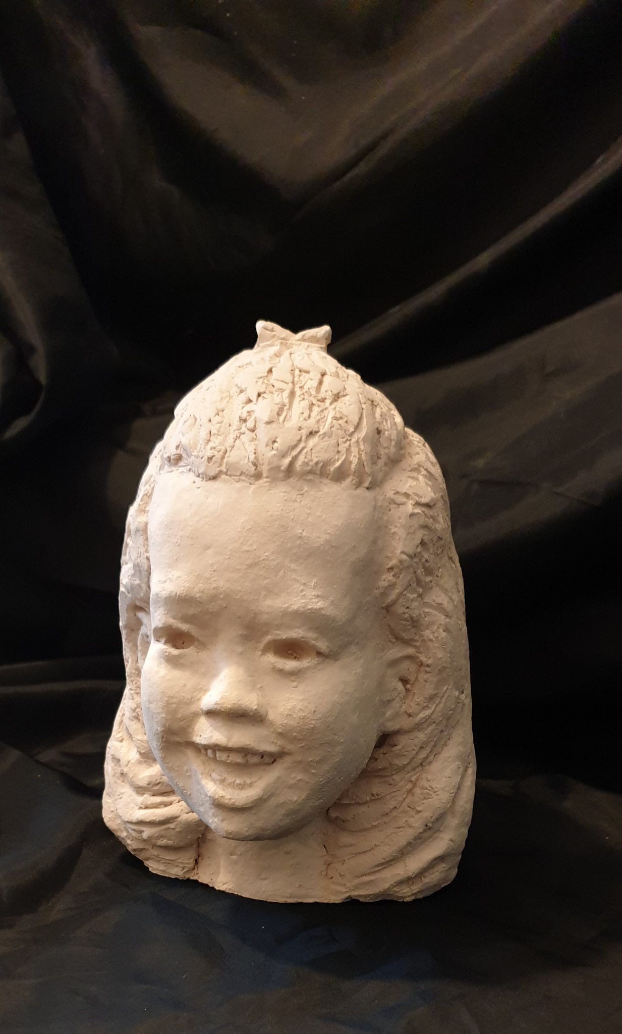 Keramiek, een vrolijk lachend kind Geboetseerd vanaf een foto. ( opdracht)