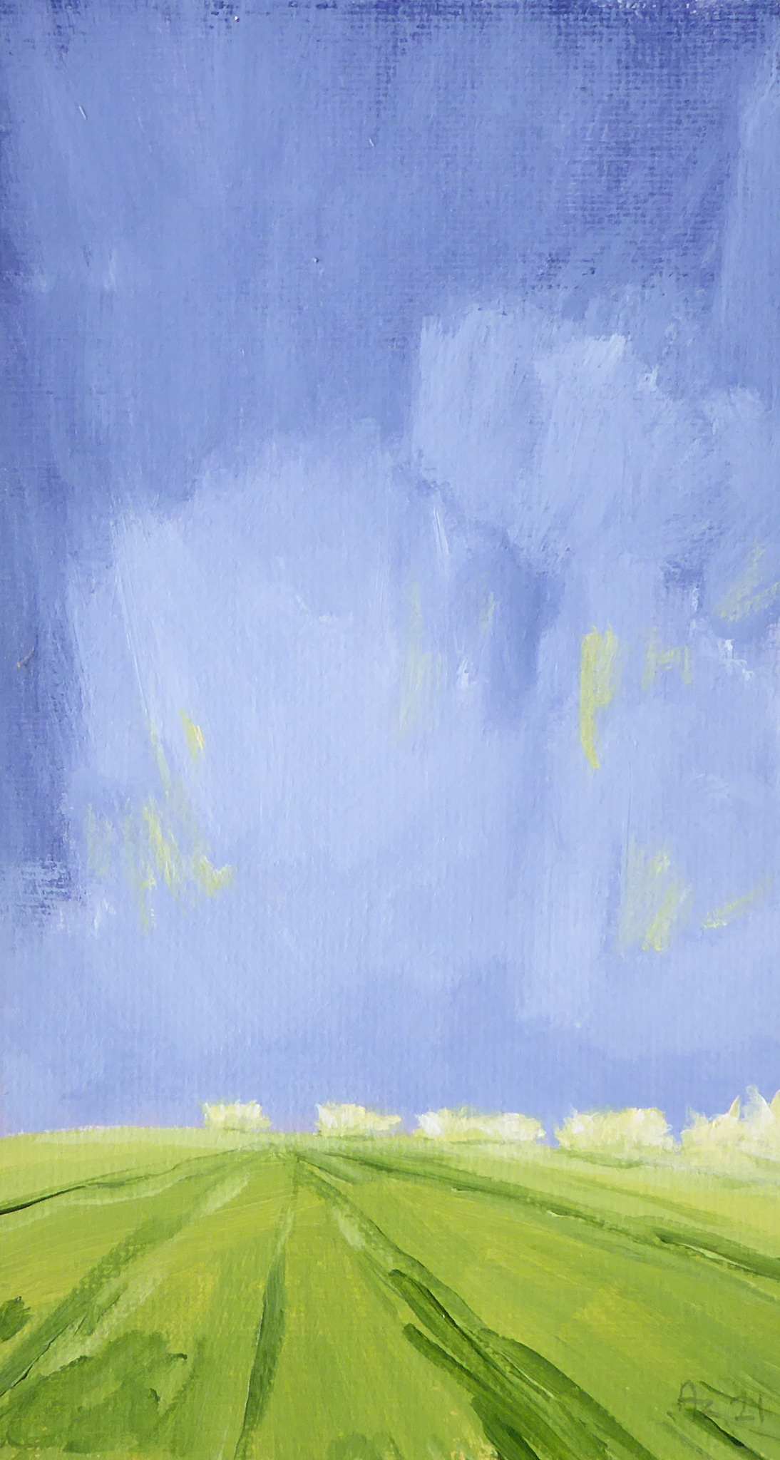 Hoogzomer. Hooi op het land. Acrylschildering op karton.