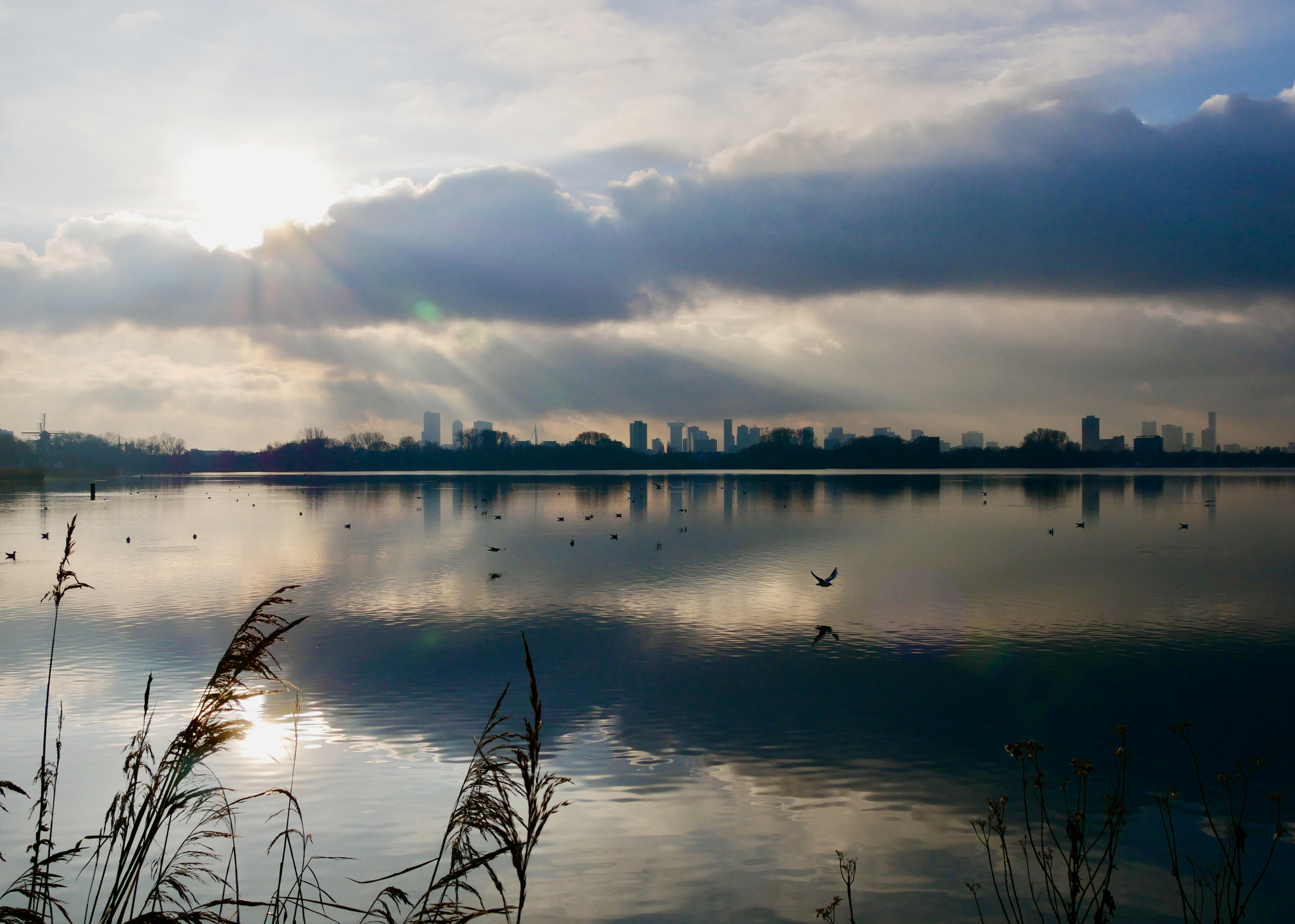 Op de laatste dag van het bizarre jaar 2020 pakken de wolken zich samen boven de Kralingse Plas. Een vogel scheert langs het water. De Zon laat zich zien. Een groene Orb beweegt zich via een zonnestraal richting water. De skyline van een wereldstad als rustig decor. Bewerkte foto gedrukt op glas voor extra diepte.