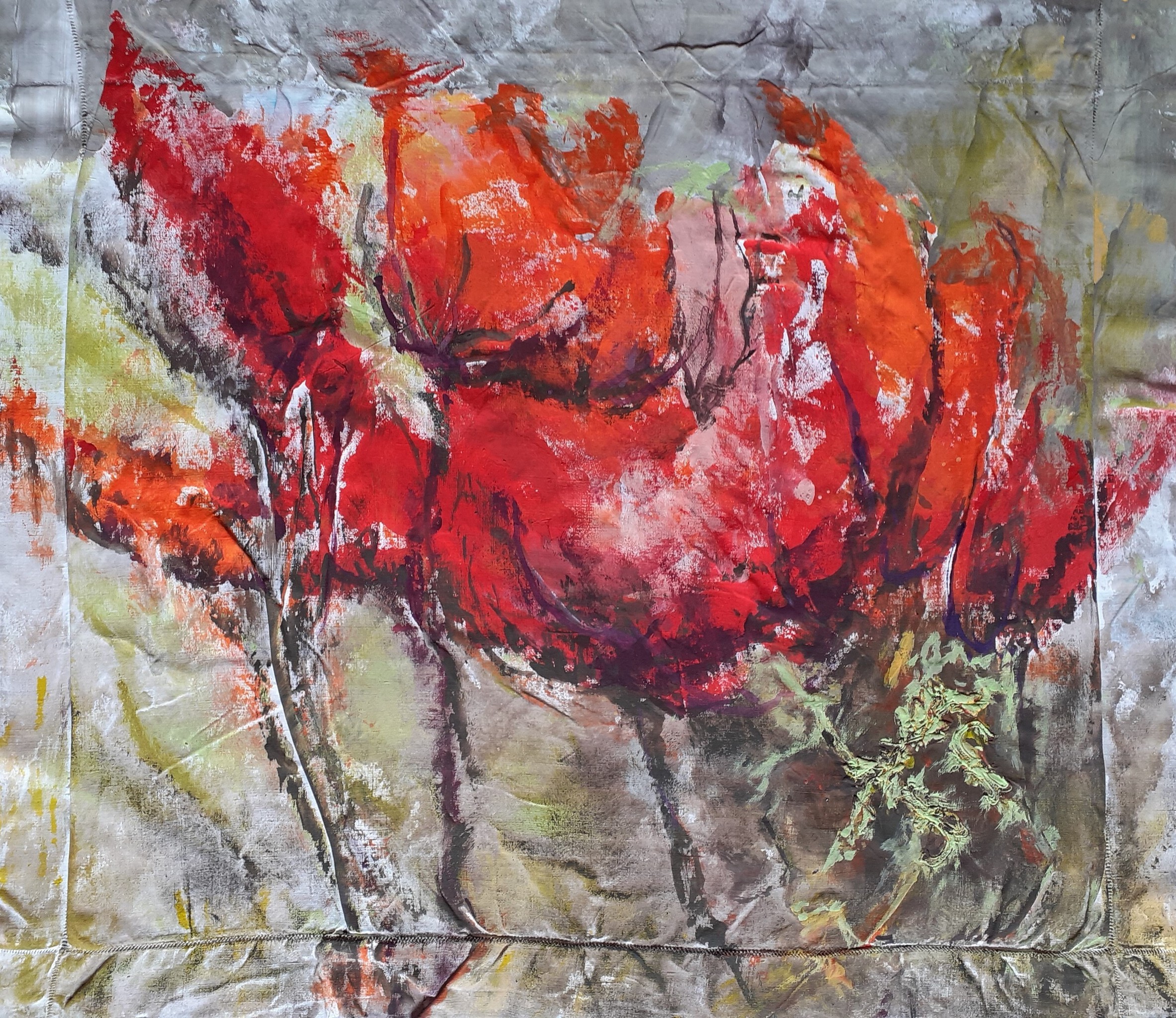 klaprozen zijn geschilderd op een oud kussensloop, het werk wordt niet geframed maar met een lat opgehangen. Het werk maakt onderdeel van 2 luik (kaprozen op oud kussensloop) maar kan onafhankelijk gekocht worden.