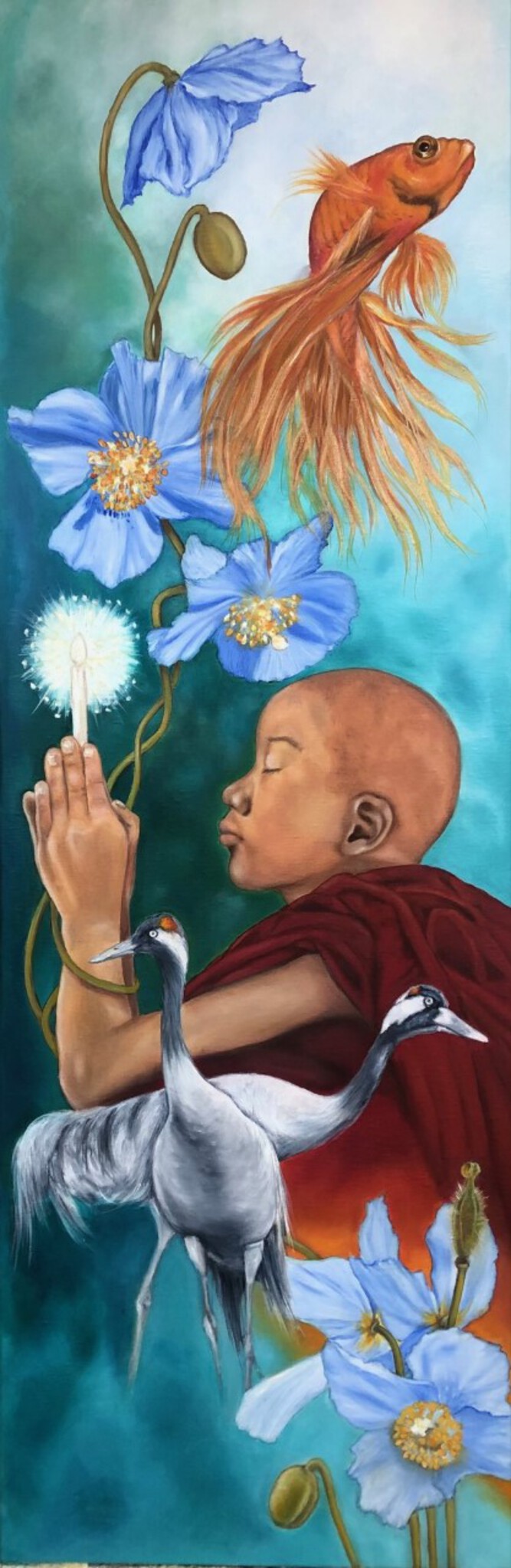monnik/vissen/kraanvogel, oliever op doek