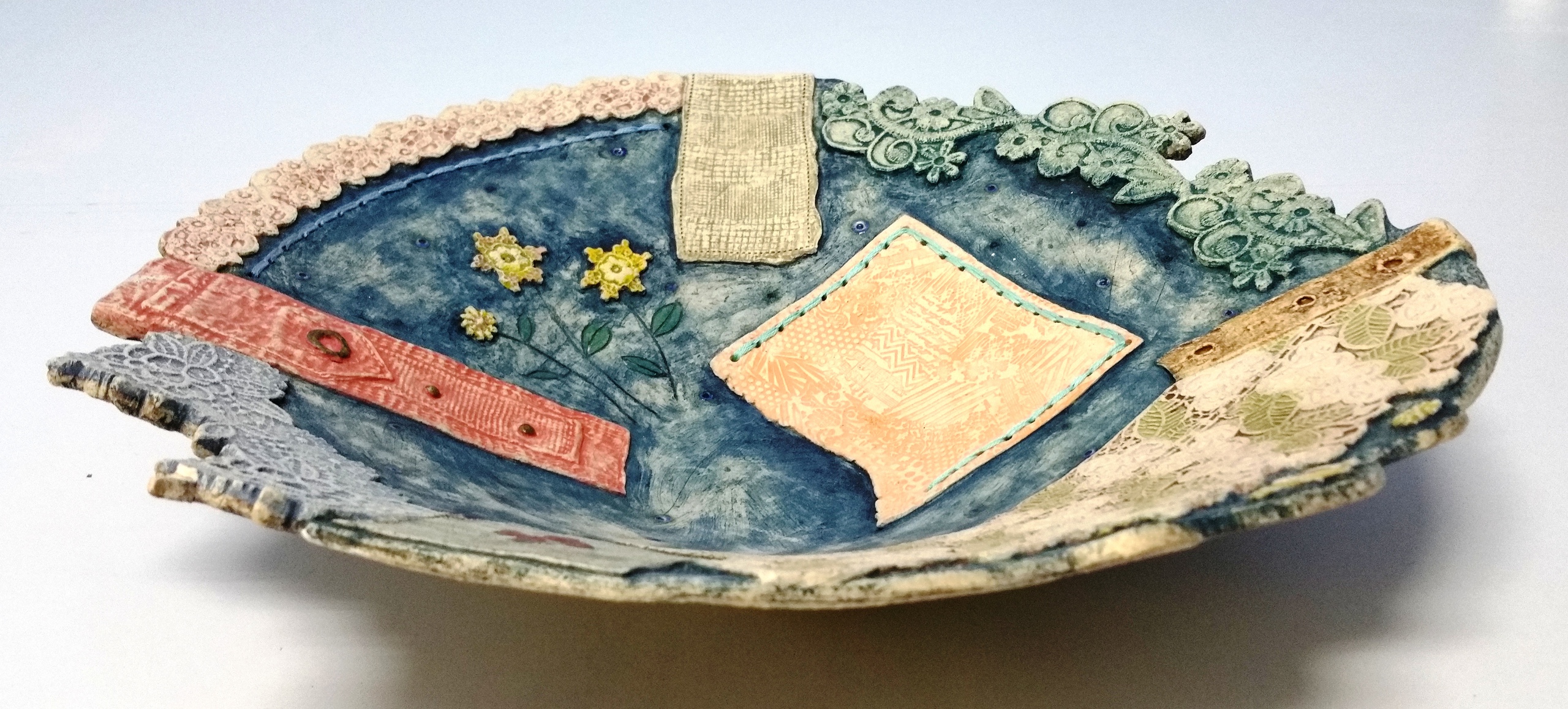 De kobaltkleurige achtergrond met zijn gesmolten stukjes glas doet me denken aan de nachtelijke hemel, maar de aardse realiteit van textiel en garen brengt het terug naar huis.