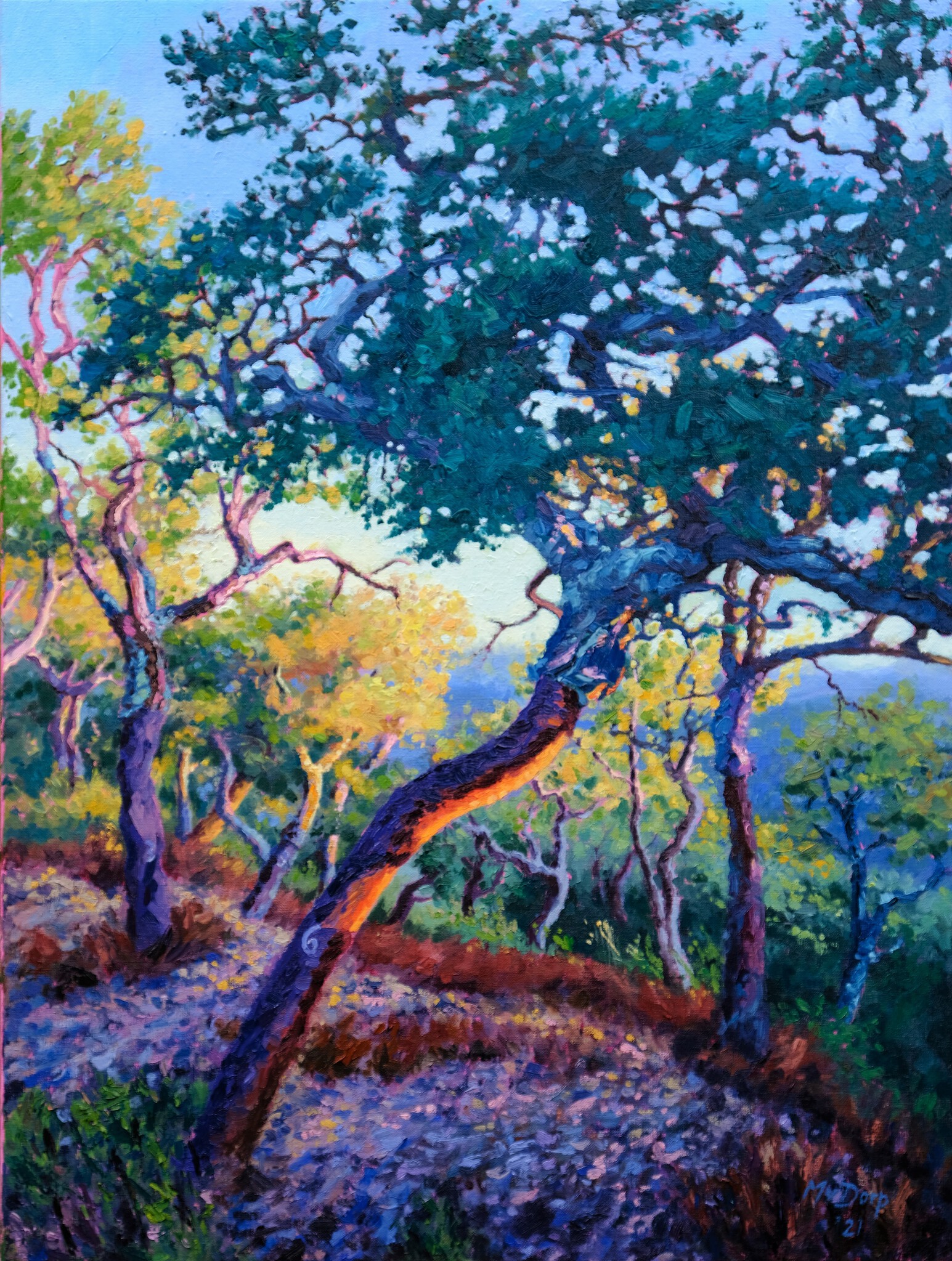 Het september licht in Portugal is vroeg in de ochtend nog koel, maar zodra hij boven de berg verschijnt kleurt hij de roodbruine gestripte bast van de kurkeiken oranje
