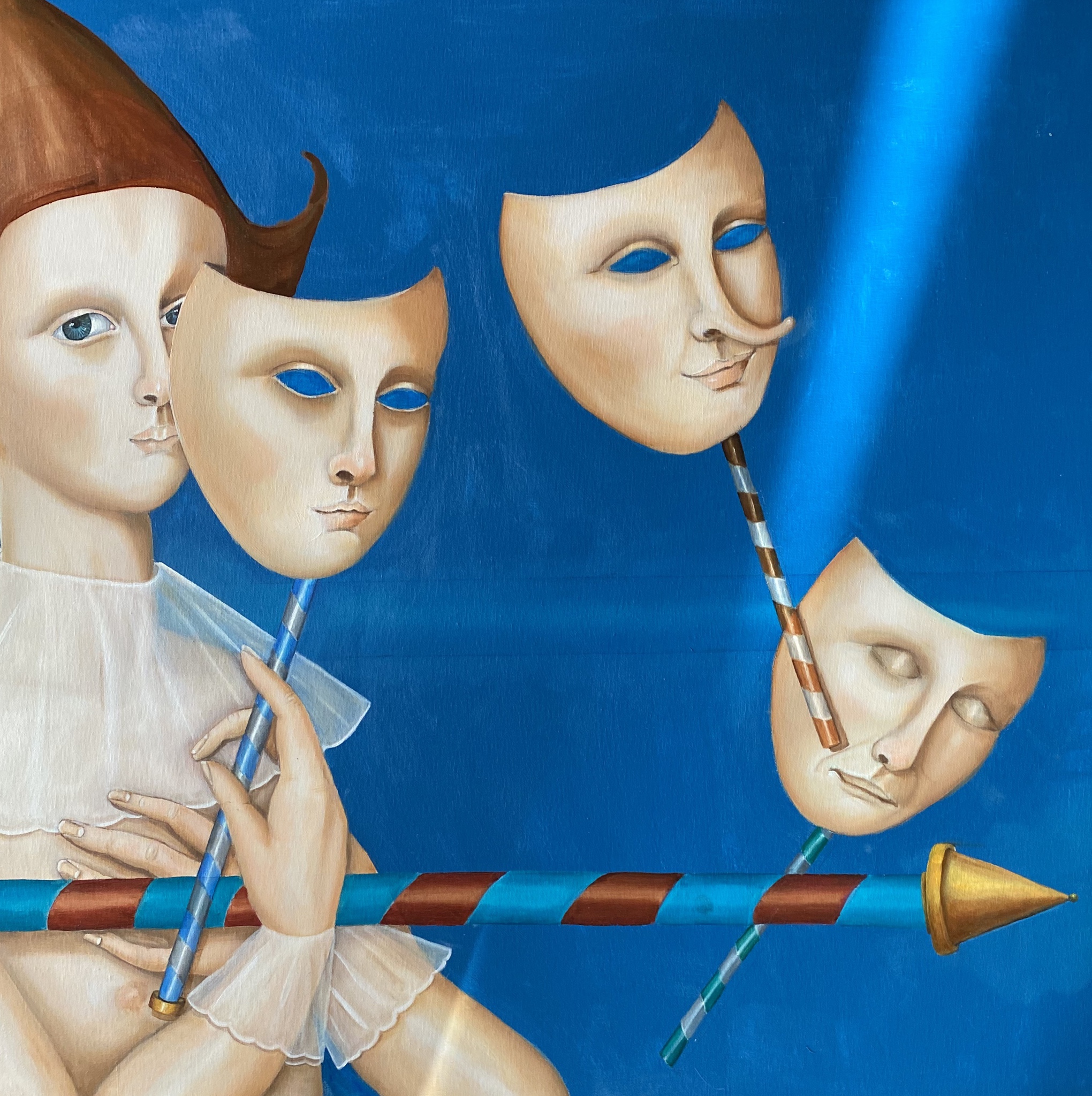 Comedia del Arte is een Italiaanse improvisatie theaterstijl van de 16 de tot de 18 de eeuw met serieuze en komische elementen.Er werd veel gebruik gemaakt van maskers. Hier gebruikt als symbool voor de meerdere identiteiten de mens kan aannemen, omdat hij die heeft of omdat hij niet goed weet waar hij voor staat of wie hij wil zijn.