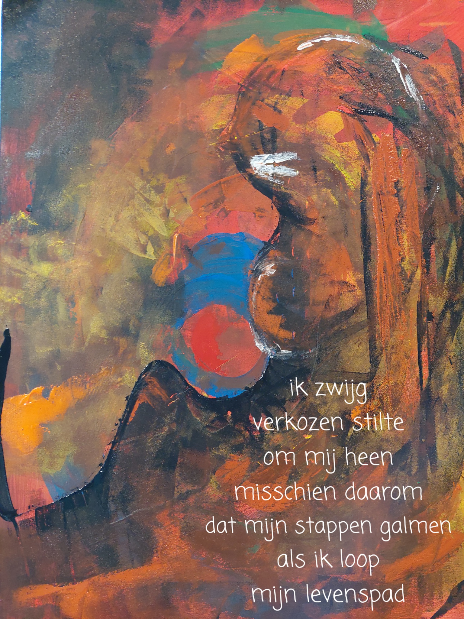 Sinds enkele jaren schilder ik vanuit mijn hart, intuitief ontstaan soms heel bijzondere elementen in mijn werk. Aan mij om dat wat verschijnt de aandacht te geven en het geheel te verbinden.
