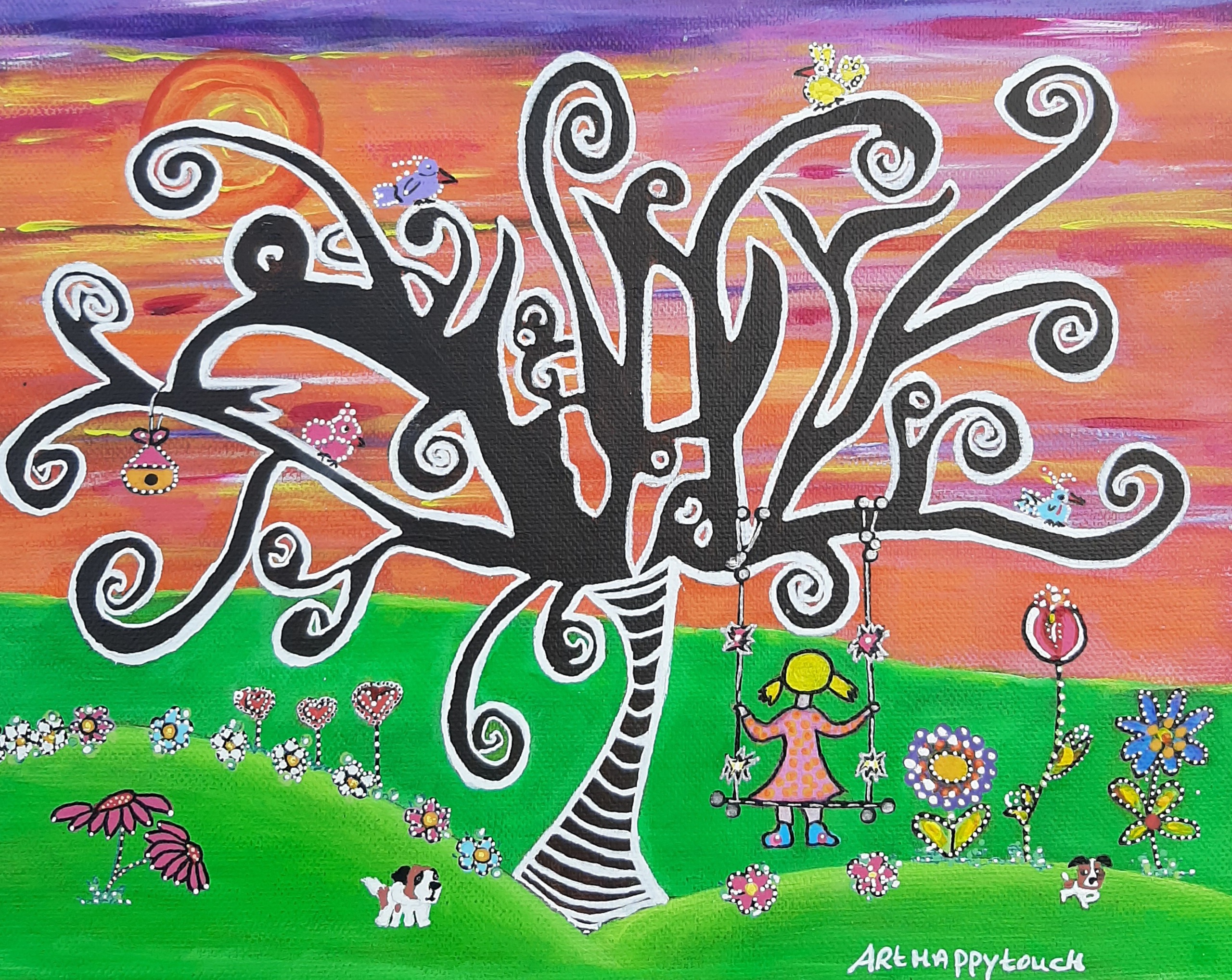 Schilderij Meisje Zon Kind Kleurrijk Op Painting Vrolijk Gras Boom Vogeltjes Blij Kinderkamer Schilderijtje Bloemetjes Heuvels Hondjes Schommel Happy
