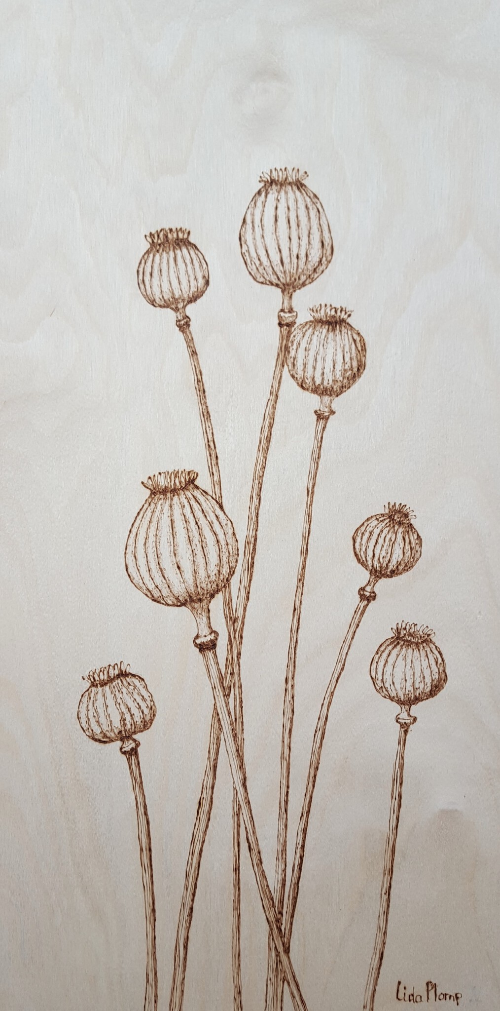 Papaverbollen. Pyrografie/ houtbrandwerk op berkentriplex in baklijst