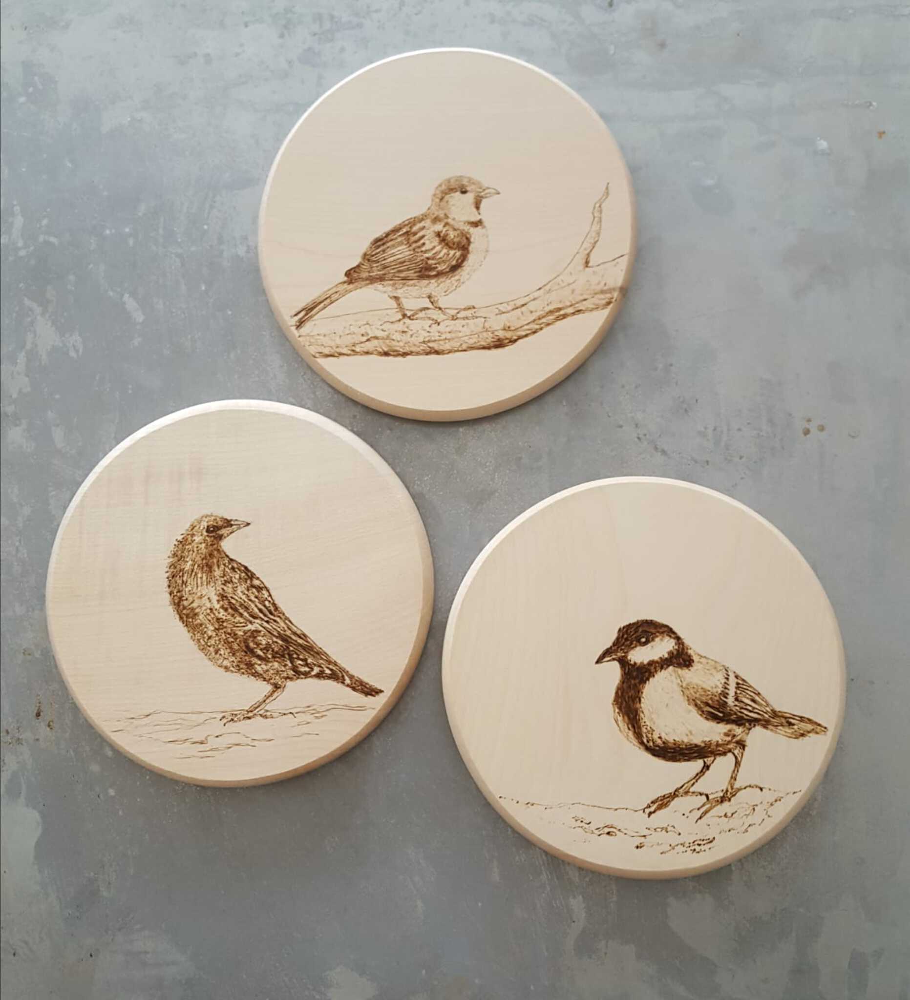 Vogels. 3 pyrografiewerken/houtbrandwerken. 3x 16 cm doorsnede