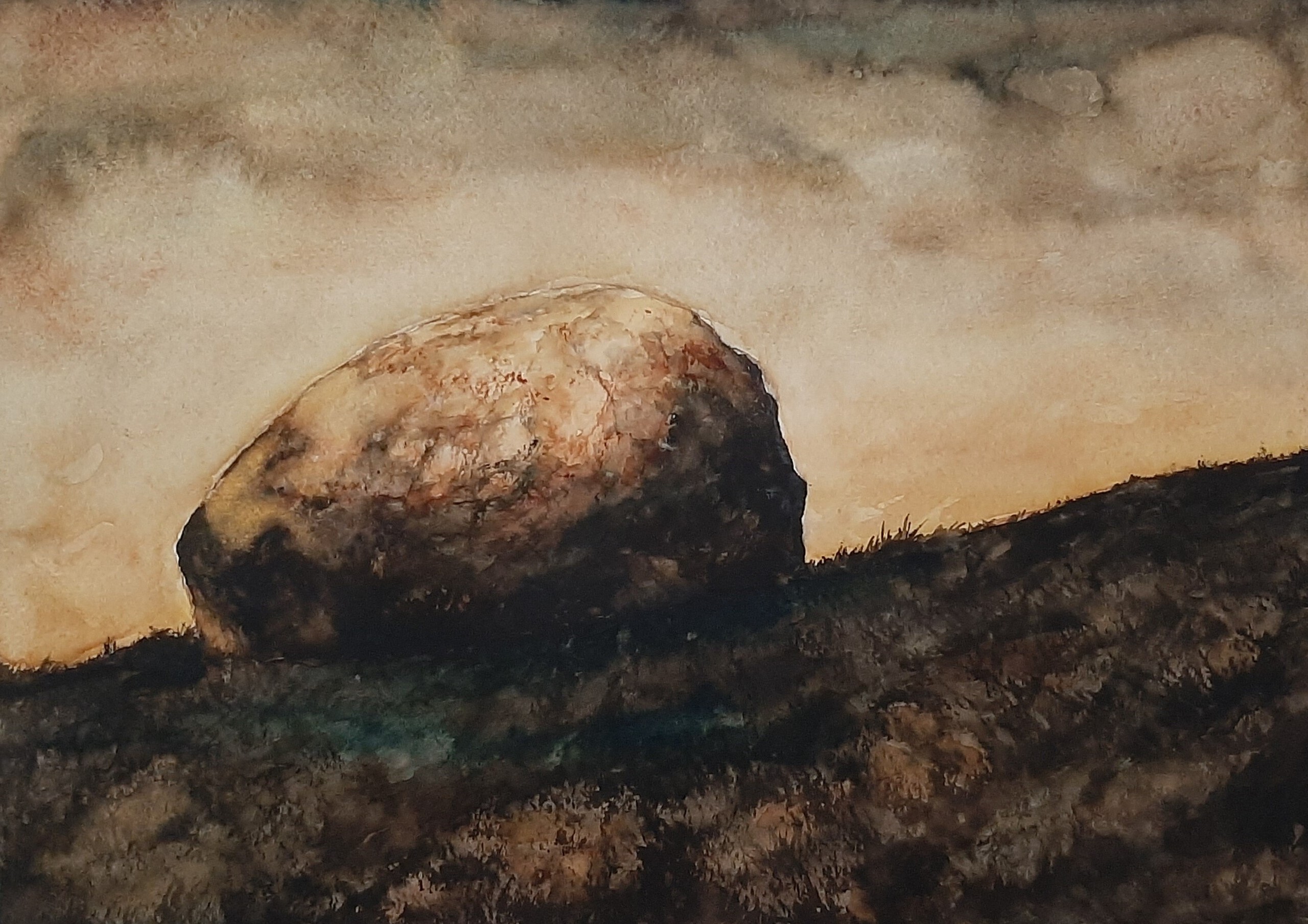 Soms volstaat het om je werk terug te voeren naar iets elementairs. Zoals een wolk, het water of zoals in deze aquarel: een steen. Onder een dreigende lucht. Een grote steen, dat dan weer wel. De vermelde prijs is exclusief lijst, glas en/of passe-partout