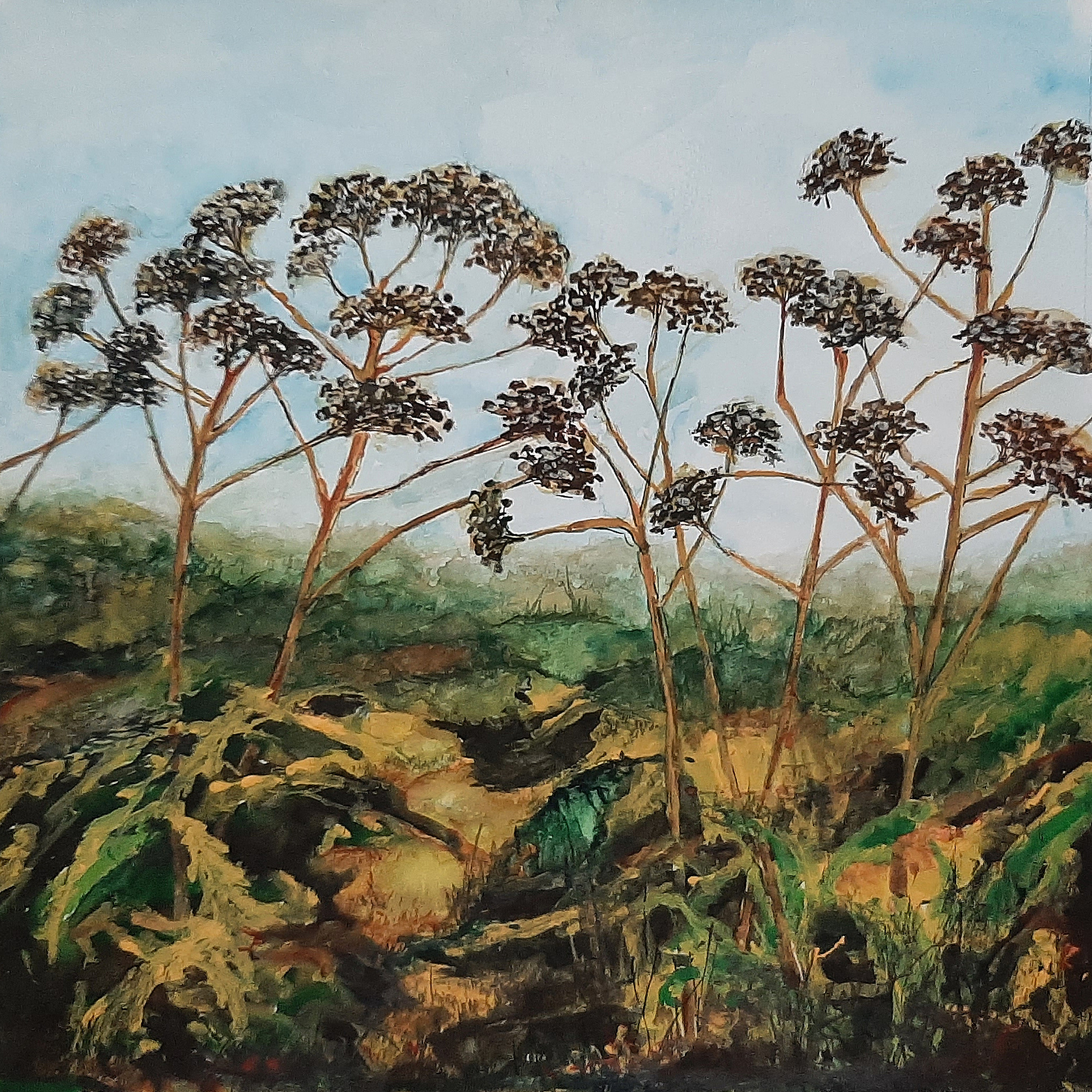 Soms kom ik tijdens mijn fietstochten prachtig bloeiende planten tegen. Zoals een heel veld reuzenberenklauwen tussen de Boekend en maasbree (Noord Limburg). Het is een invasieve exoot van een paar meter hoog vaak..Het sap van deze imponeren schermbloemige plant kan ernstige gevolgen hebben als het op je huid komt. Toen ik er passeerde waren de planten al over hun bloei-hoogtepunt heen. Het aquarel is gemaakt op 300grams Canson Montval papier. De vermelde prijs is exclusief lijst, glas, passe-partout en/of verzendkosten.
