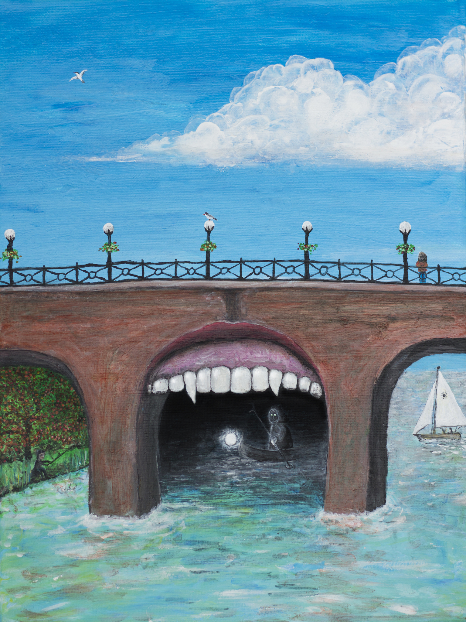 Een surrealistisch schilderij in acrylverf. Het schilderij toont drie bogen van een stenen brug. De middelste boog is een onverwacht tafereel. Aan de bovenrand zit een rij tanden alsof je een mond binnengaat. Het tafelreel achter de boog is donker, terwijl de rest van het schilderij een zonnige dag is. Je ziet een boot met een gedaante in de mond; dat is Charon de veerman naar de onderwereld. Geïnspireerd door de Griekse mythologie.
