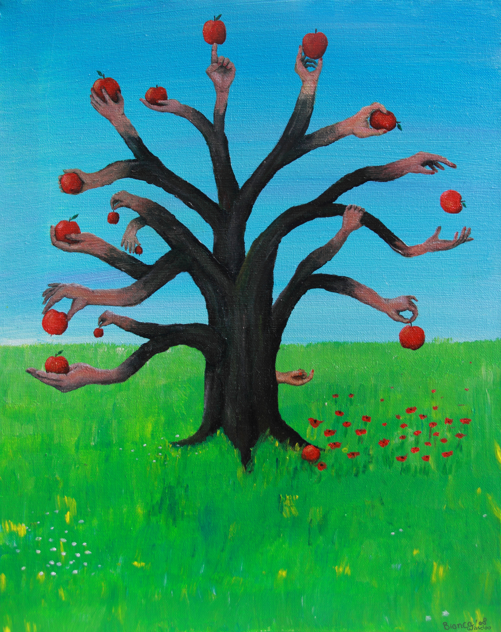 Een acryl schilderij van een bijzondere appelboom. De takken zijn armen met aan het eind een hand. Appels van verleiding.... De boom staat in een plat graslandschap en de lucht is helderblauw.