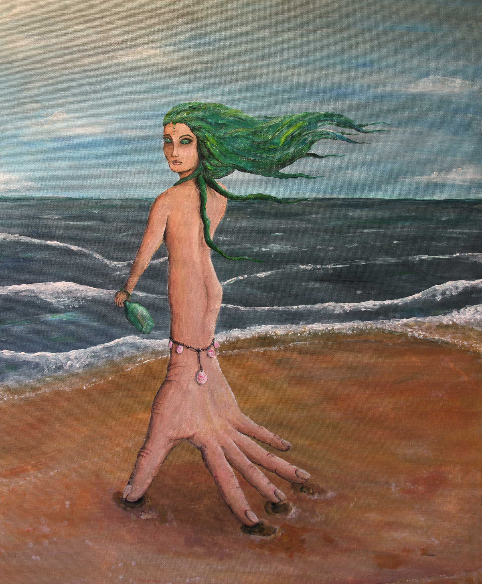 Een surrealistisch schilderij van een heel vreemde zeemeermin. In de vorm van vinnen of benen heeft ze een hand als benen. Je ziet haar van achteren. Ze kijkt erg boos. Er ging iets heel erg mis. In haar hand heeft ze een boodschap in een fles. Haar haar en ogen zijn groen.