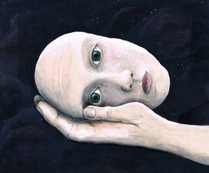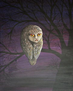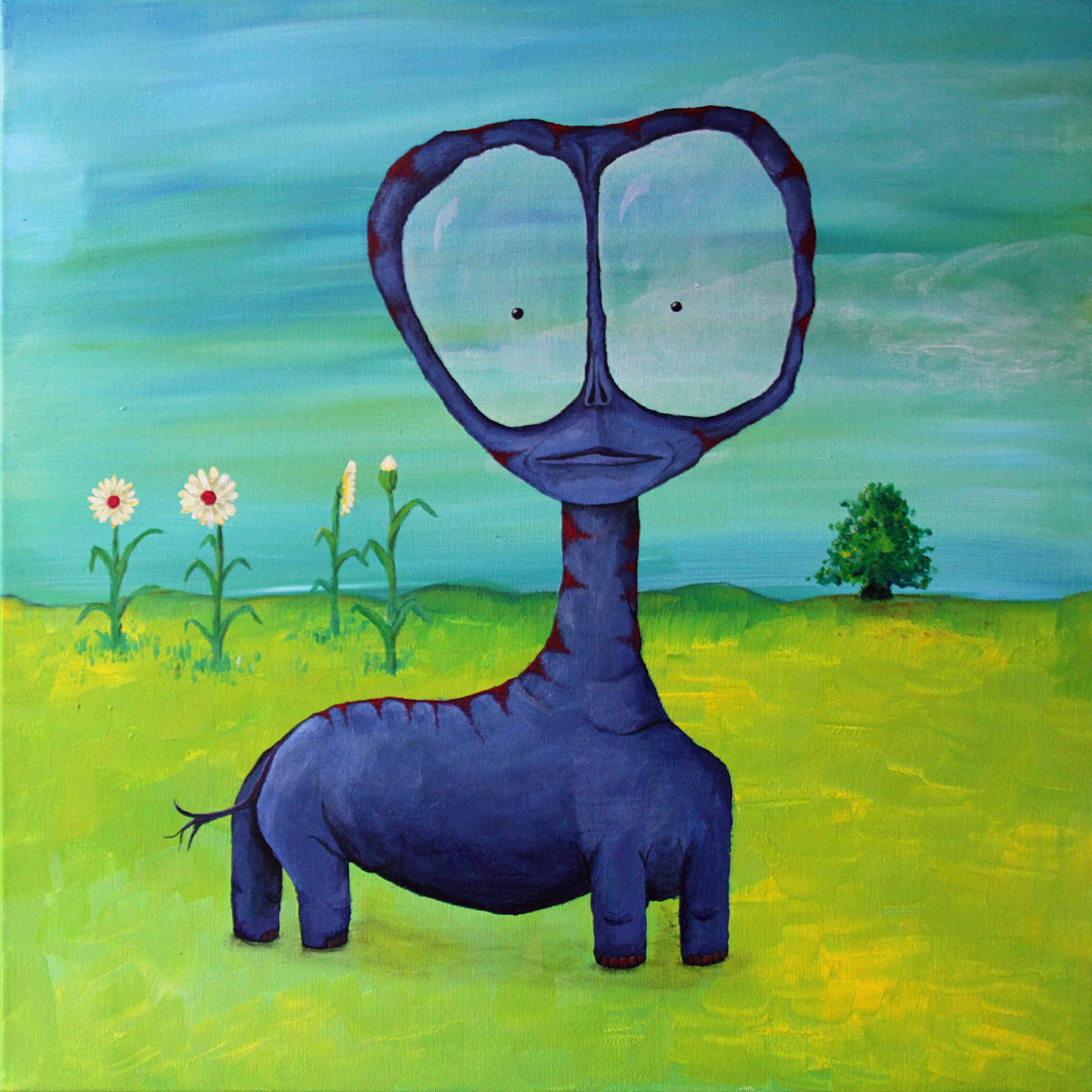 Een schilderij van een fantasiewezen. Het is een paars wezen dat enorme ogen heeft waar je de achtergrond doorheen ziet schijnen. Hij heeft erg kleine pupillen. Hij staat in een vlak landschap met enrome bloemen en een klein boompje op een fel geelgroen veld. De lucht is blauw met groenige zwemen en licht bewolking.