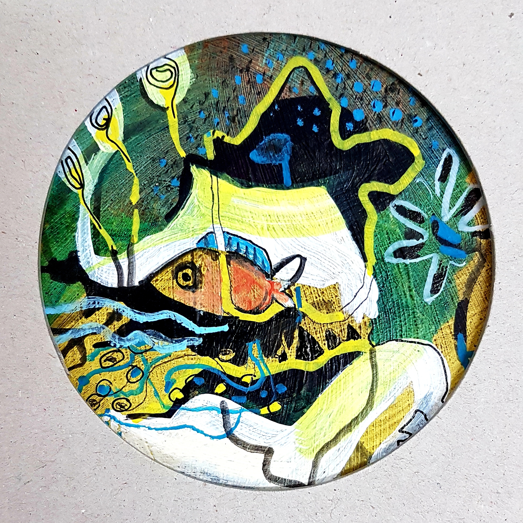 Moderne kunst op een bierviltje. Ingelijst in naturelkleurige passe-partout. A5 formaat