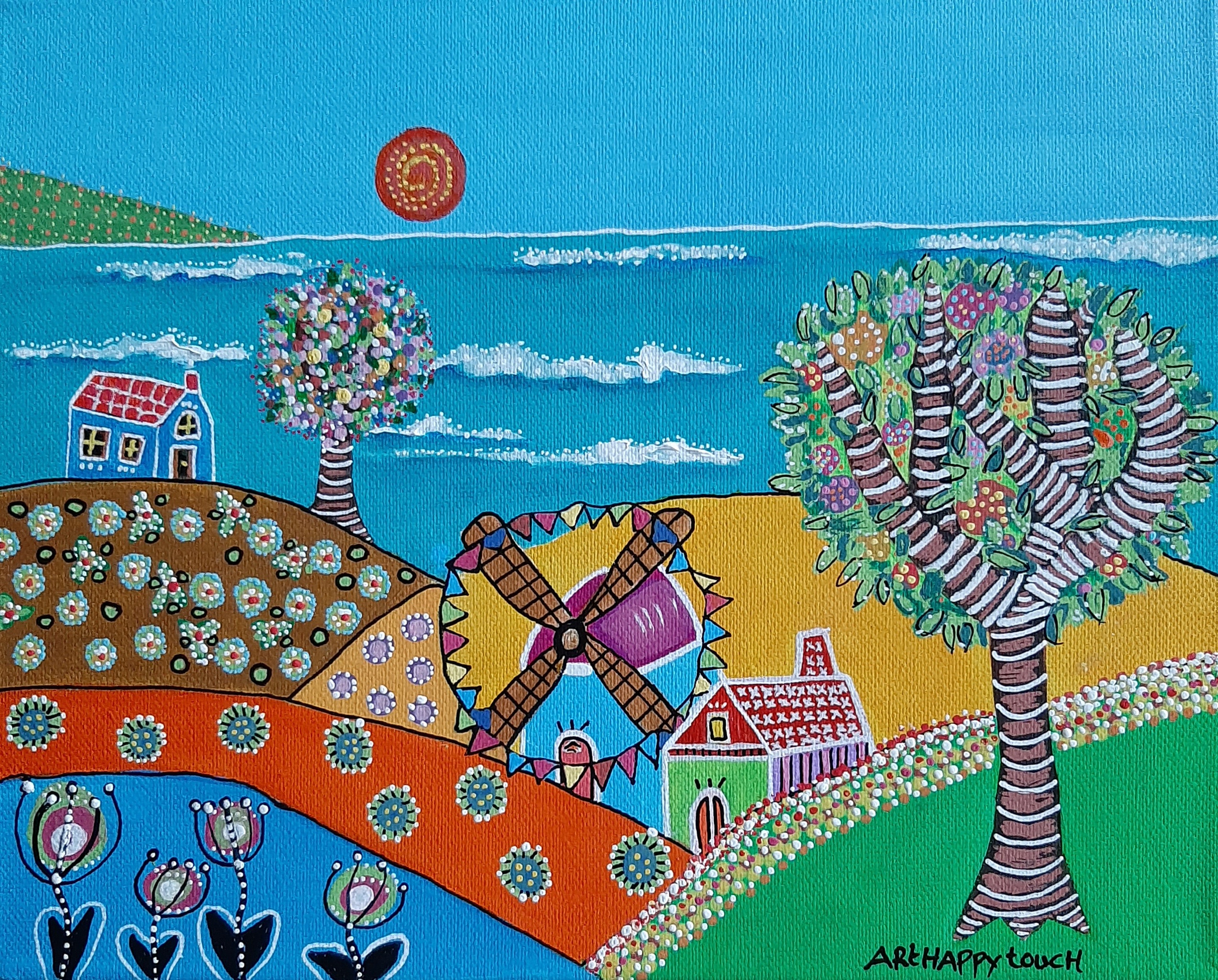 Schilderij Zee Zon Feest Water Kleurrijk Painting Vrolijk Vlaggetjes Blij Kinderkamer Dorpje Huisjes Molen Happy Mill Sunny Zonnig Bloemen