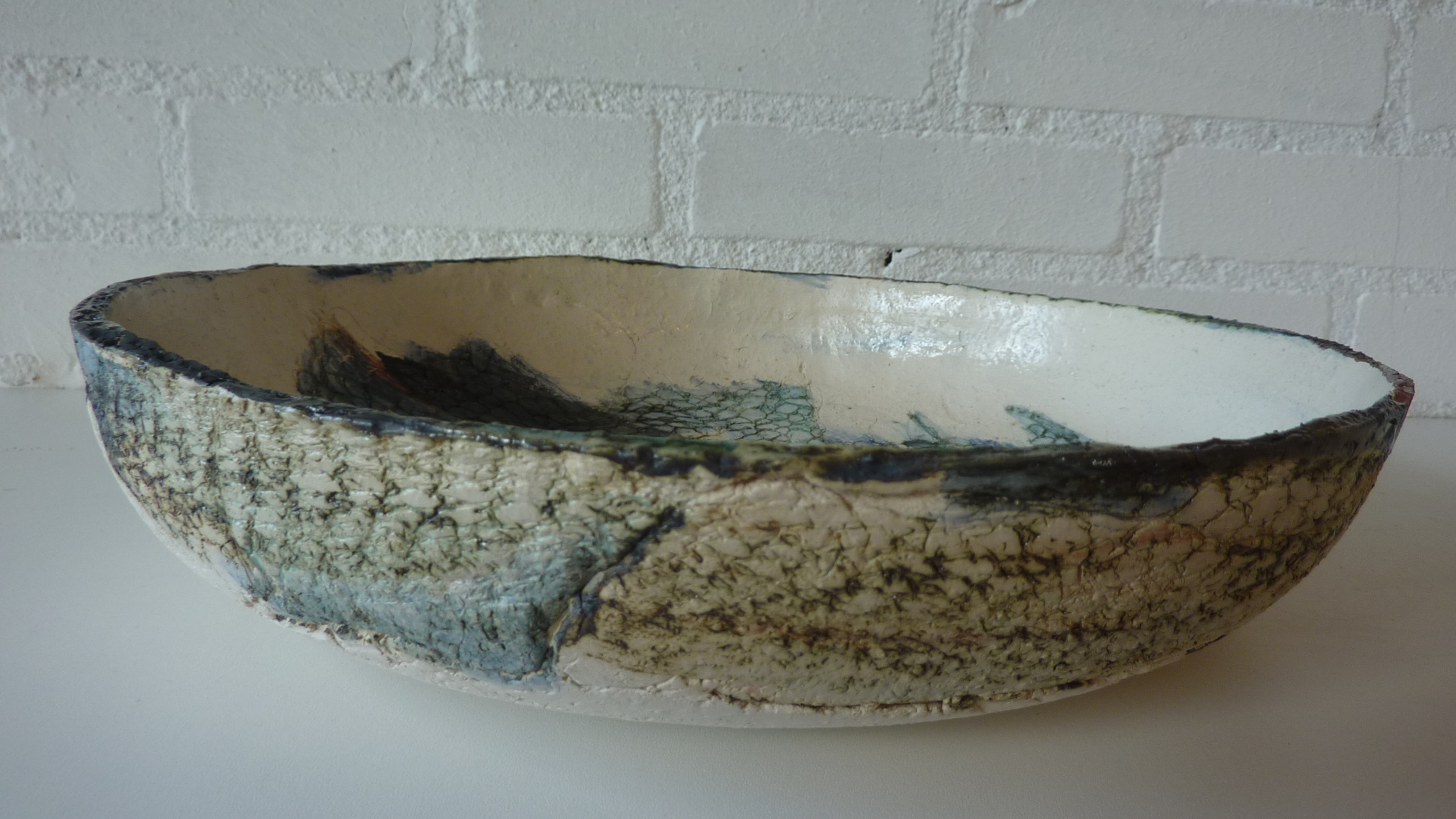 Schaal gemaakt van grove chamotte klei en bewerkt met kobalt