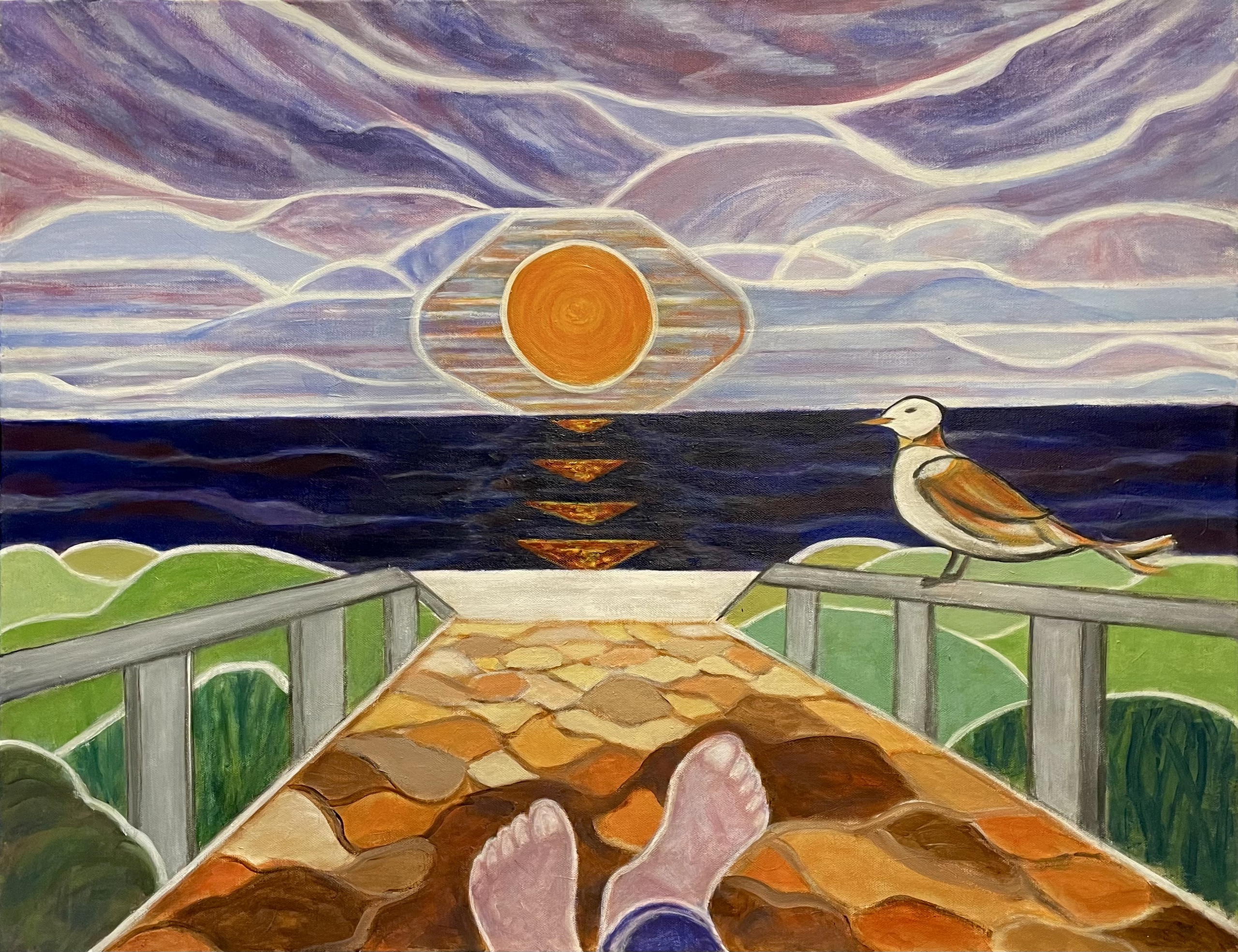 Een relaxte zonsondergang in een fantasielandschap waar je zo met je blote voeten in wilt stappen! Vrolijke grafisch-gestileerde voorstelling met zon, zee en strand in felle kleuren.