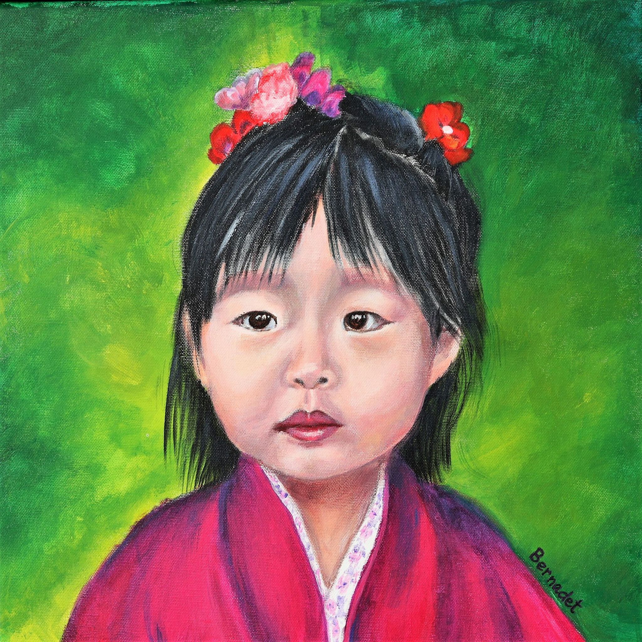 Meisje Acryl Groen Kind Portret Ogen Vierkant Wereld Japan Exotisch 40 Japans Azie Sprekend Mondiaal Werelds