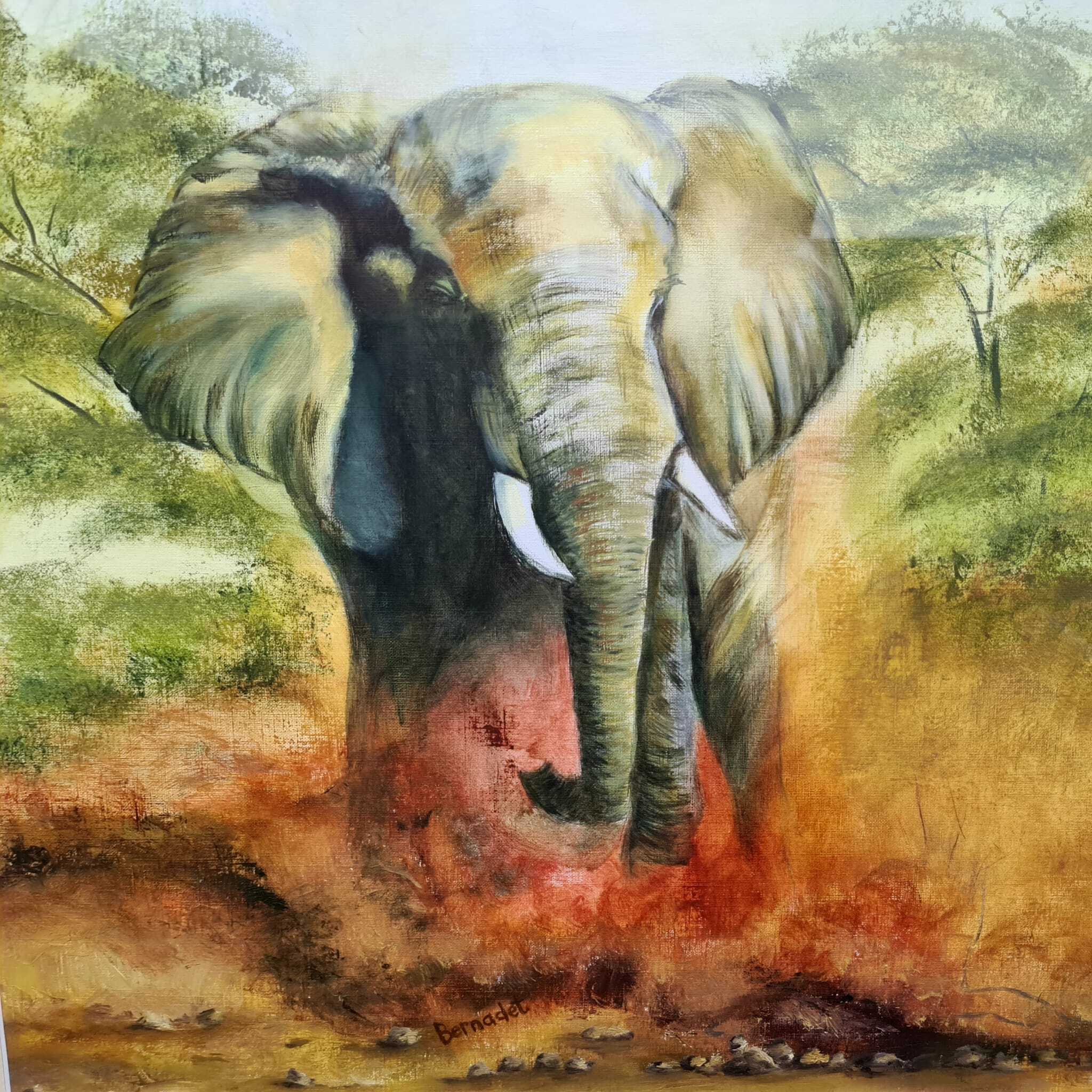 Furious - olifant geschilderd met olieverf op papier, in lijst achter glas. Grootte incl. lijst 60 x 82