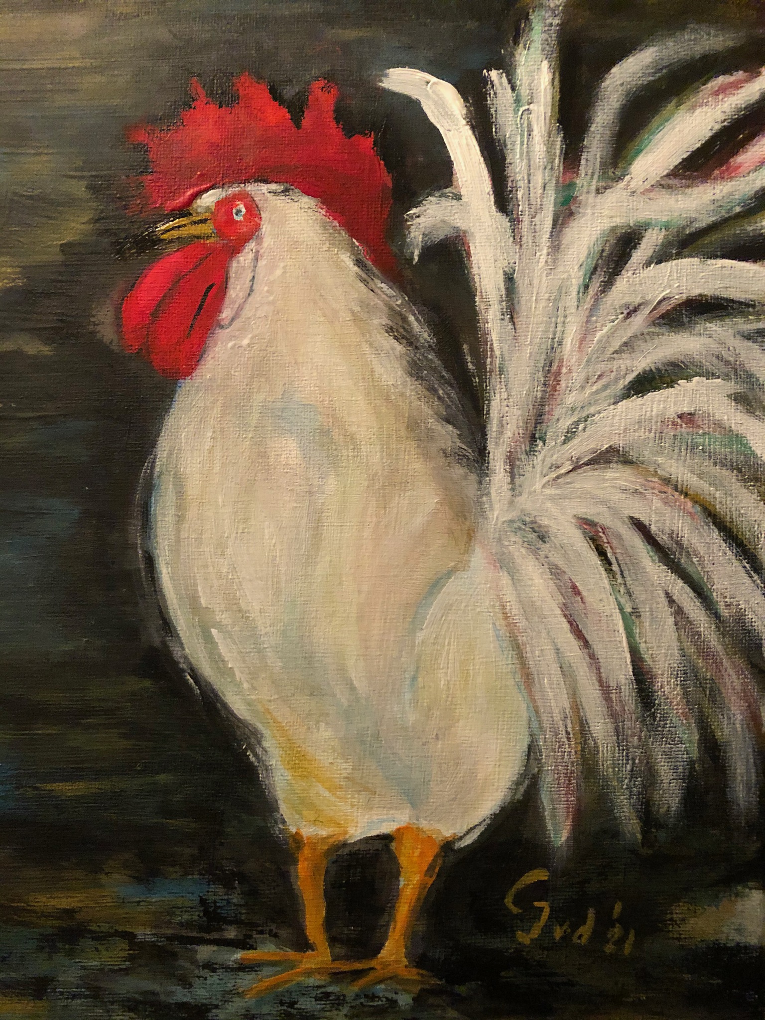 Haan met acryl op canvas.