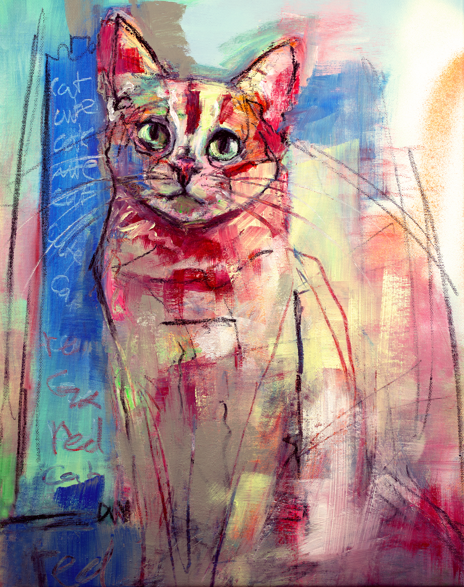 Schilderij Rood Blauw Ogen Kat Poes Kleur Lief Expressionisme Zit