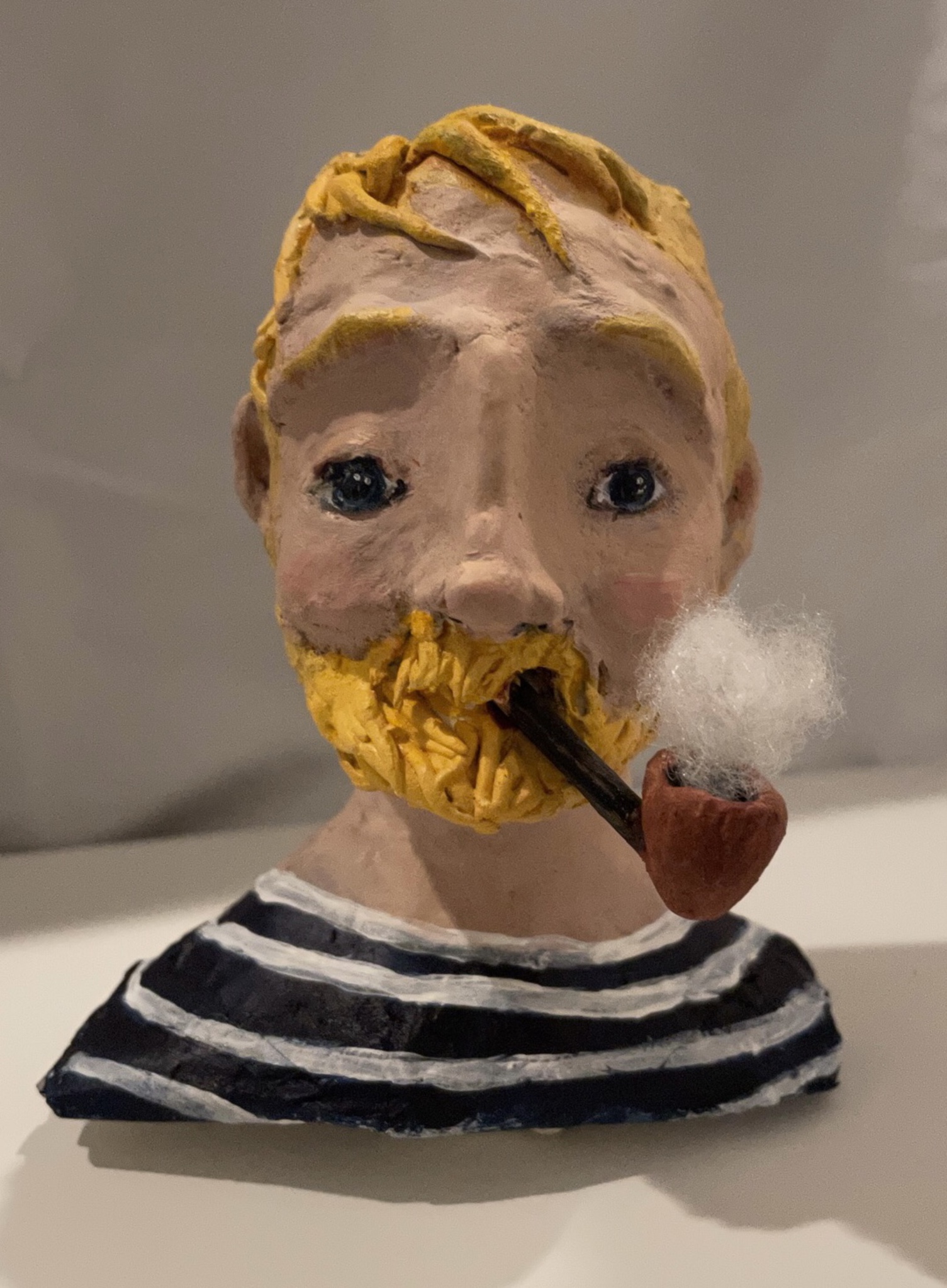 Minibuste van zeeman met blauw-wit gestreept shirt en pijp. Gemaakt van papier, schildertape en vederlichte papierklei. Ondanks het gewicht is het materiaal soepel om mee te werken en na droging heel sterk. De papierklei is afgewerkt met acrylverf.