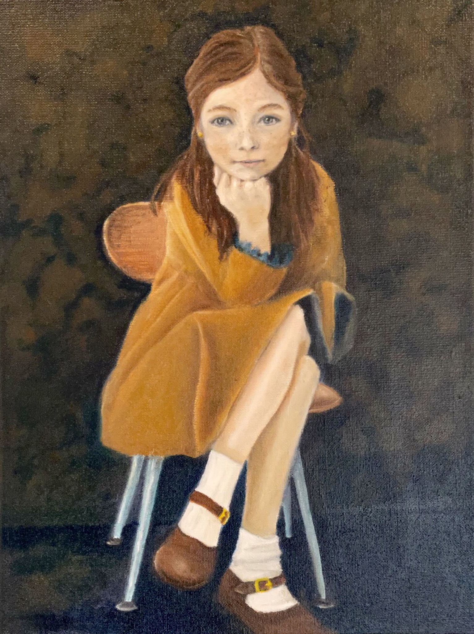 Portret van meisje in okergele jurk, zittend op stoel. Het werk is gemaakt met olieverf op alkydbasis op linnen.