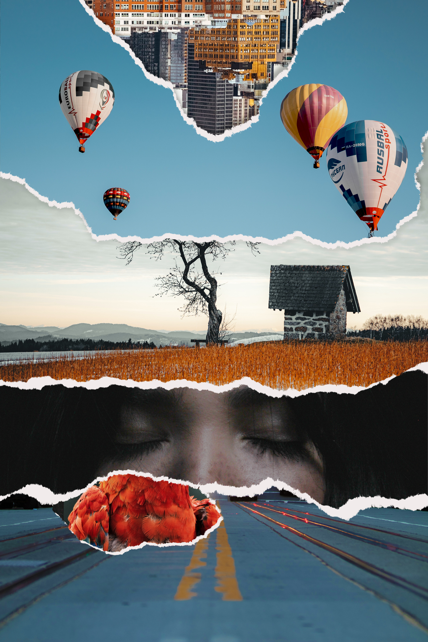 Huis Collage Landschap Portret Vrouw Luchtballon Weg Stad