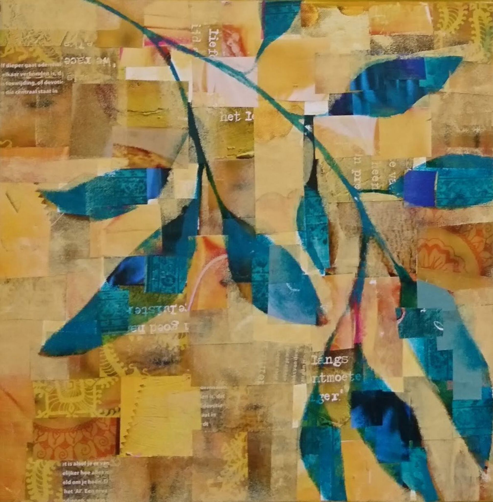 Collage van tijdschriftpapier van bladeren in groen en blauwtinten op een gele achtergrond