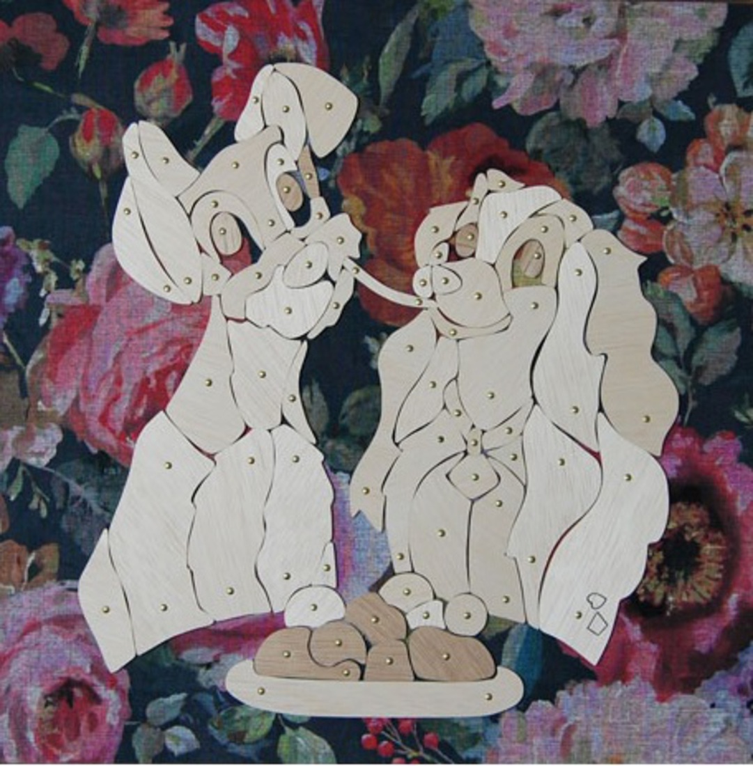 De bekende spaghetti scene uit de Disney klassieker Lady en de vagebond abstract vertaald.Gemaakt van dun blank hout, vastgezet met spijkers en een bloemen patroon als achtergrond.