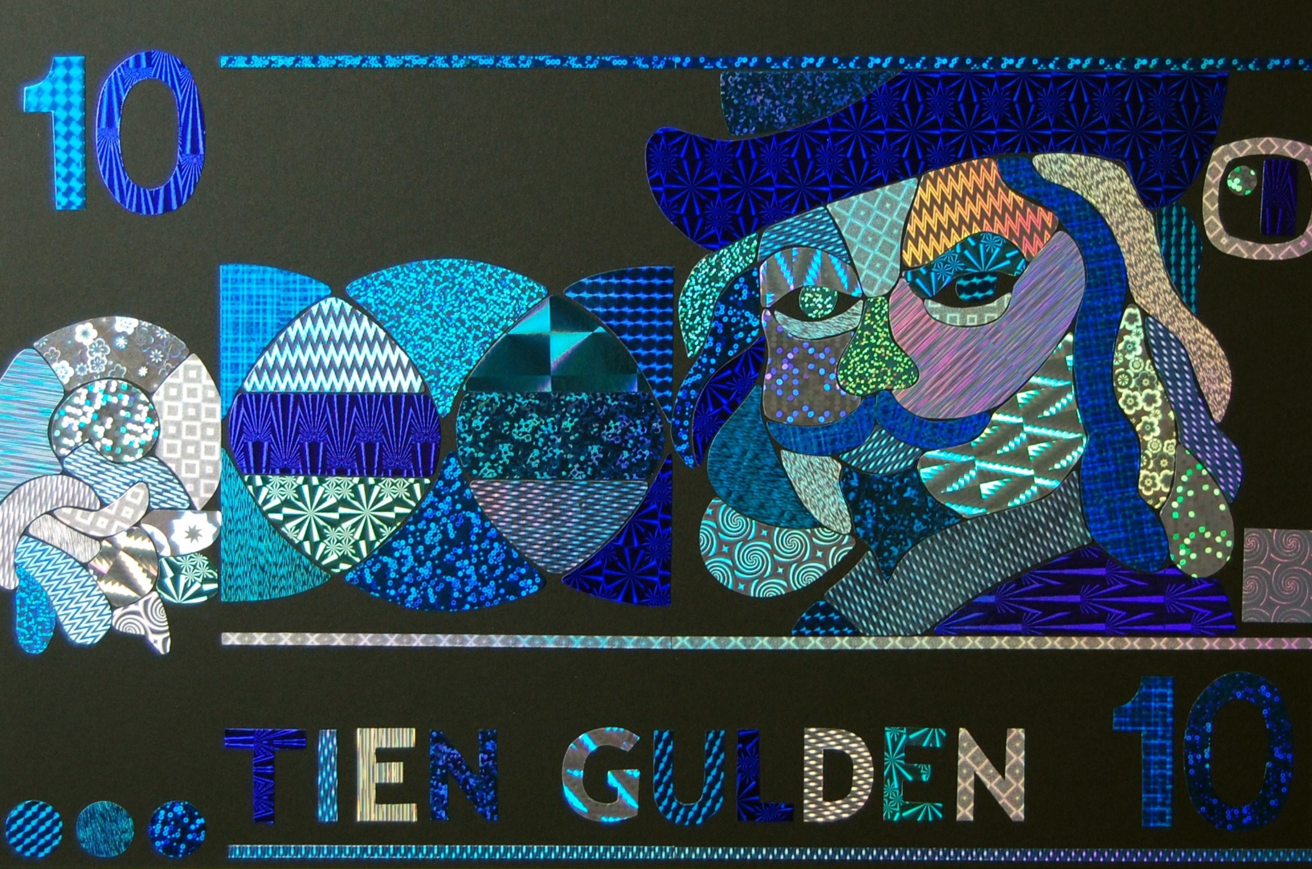 Een ode aan de prachtige gulden biljetten. Tien gulden atract vertaald in verschillende soorten blauw en zilver holografisch papier.
