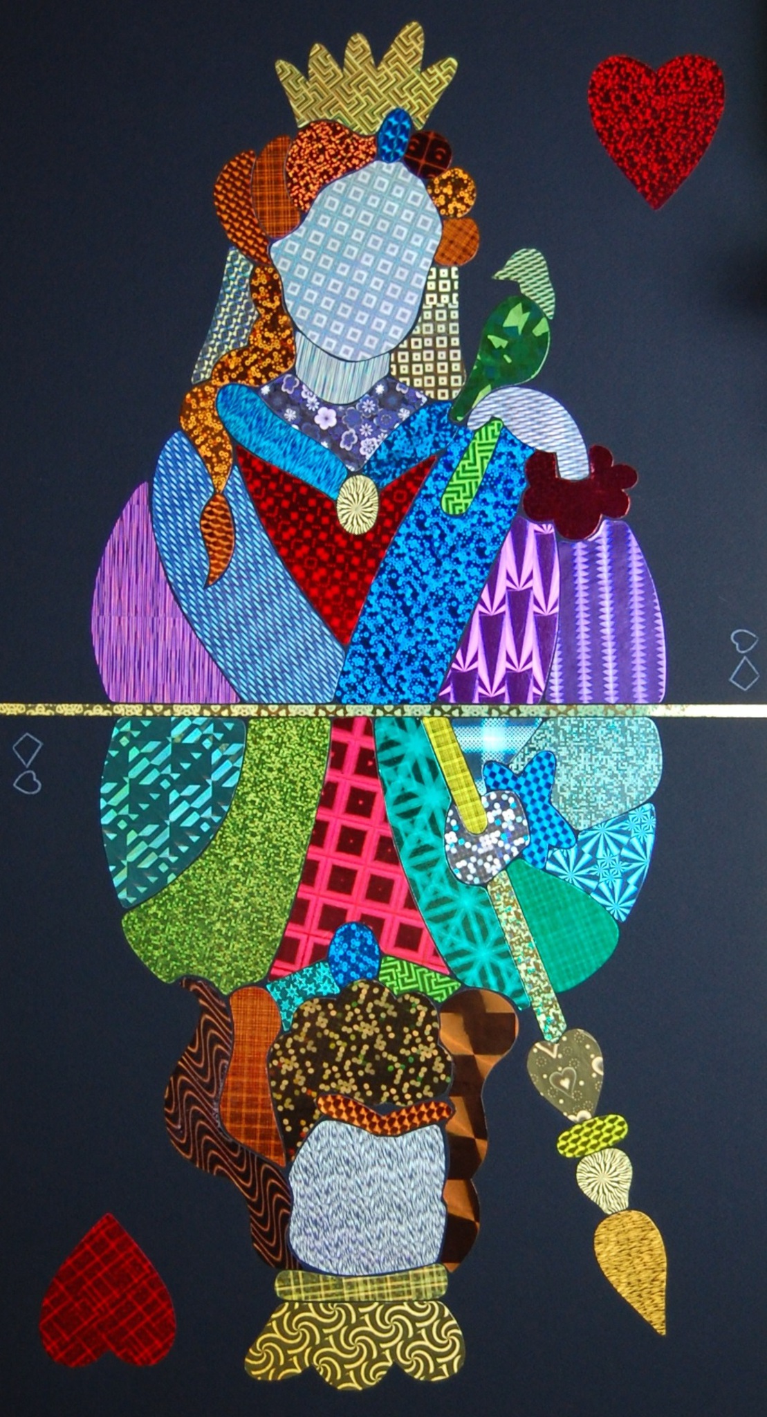 Hartenvrouw en koning in één beeld. Dit kleurrijke abstracte werk is gemaakt van verschillende soorten en kleuren holografisch papier op een zwarte ondergrond.