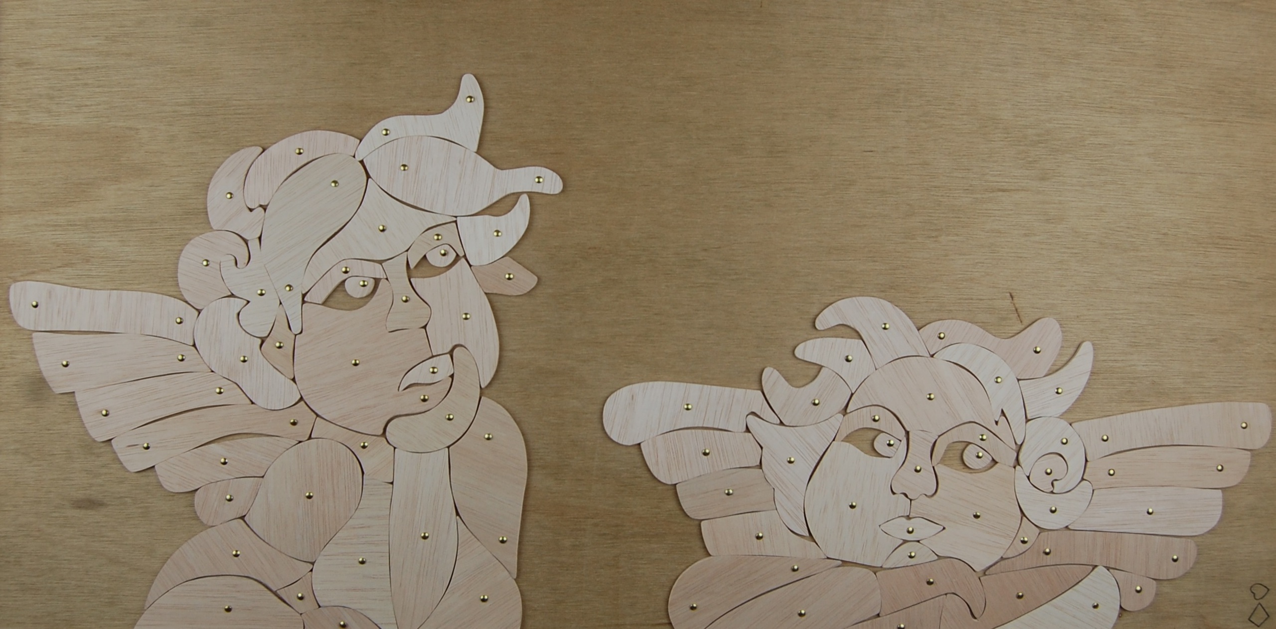 De meeste bekende cherubijntjes abstract vertaald in dun blank houten plaatjes vastgezet met gouden spijkers op een blanke houten oplaat.