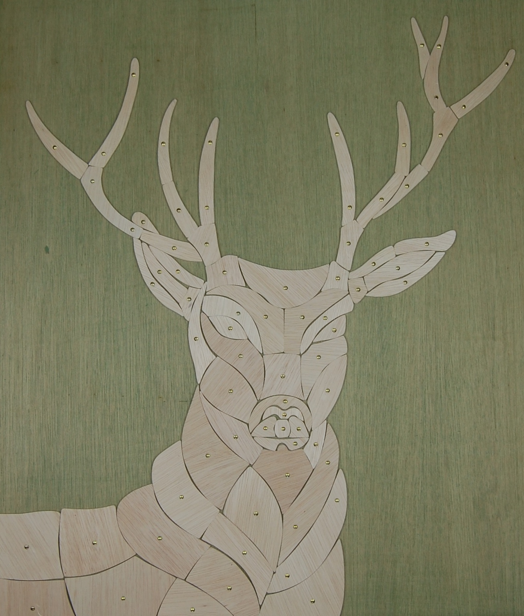 Abstract hert gemaakt van dun houten plaatjes vastgezet met gouden spijkers op een groene houten onderplaat.
