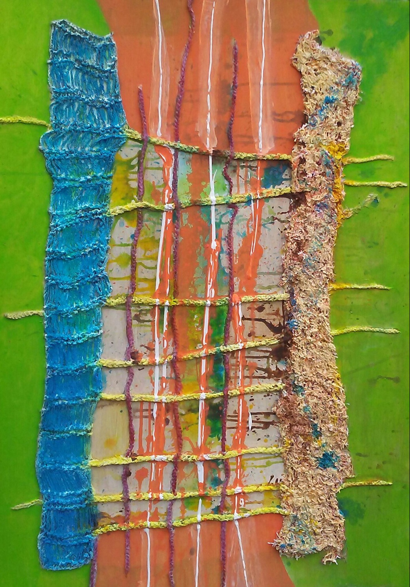 In dit schilderij zit gebreide wol, gehaakte wol en een aardappelzak verwerkt.