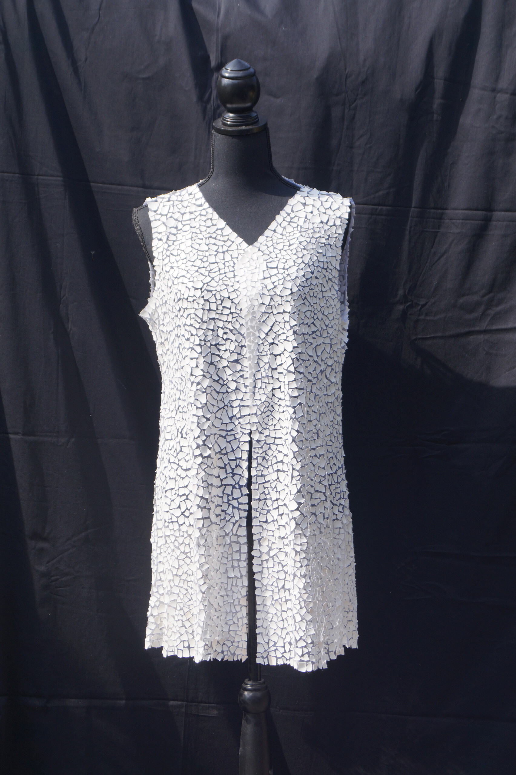 "Kwetsbaar"is een vest dat gemaakt is van tule en eierschalen en is de tegenhanger van "Harnas" dat gemaakt is van keramiek.