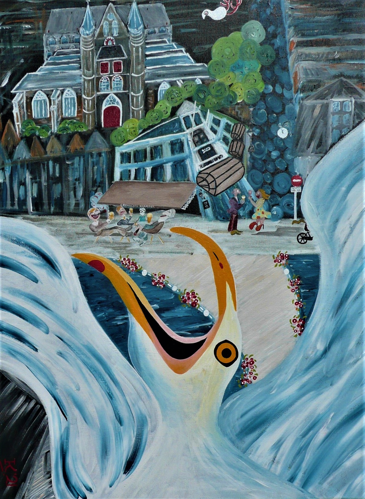 Als je op een terras in Leiden zit, moet je soms oppassen dat je broodje niet gekaapt wordt door een meeuw. Op het schilderij ‘De schreeuw van Leiden’/'The seagull from Leiden' komt een meeuw vanaf het Rapenburg aanvliegen (‘dronehoogte’, zou ik zeggen). Onder zijn linkervleugel zie je nog een stukje dak van de universiteit, direct onder hem de brug met bloembakken, er zitten en staan mensen bij café Barrera, de achterkant van een fiets is te zien, net zoals de Pieterskerk. Een klein vogeltje kijkt verschrikt toe en de klok in de Kloksteeg geeft vijf voor twaalf aan… De prijs is zonder verzendkosten Als je je aanmeldt voor mijn maandelijkse gratis nieuwsbrief - zie linksonder, onder 'contact'- krijg je 20% korting bij aanschaf van dit werk.