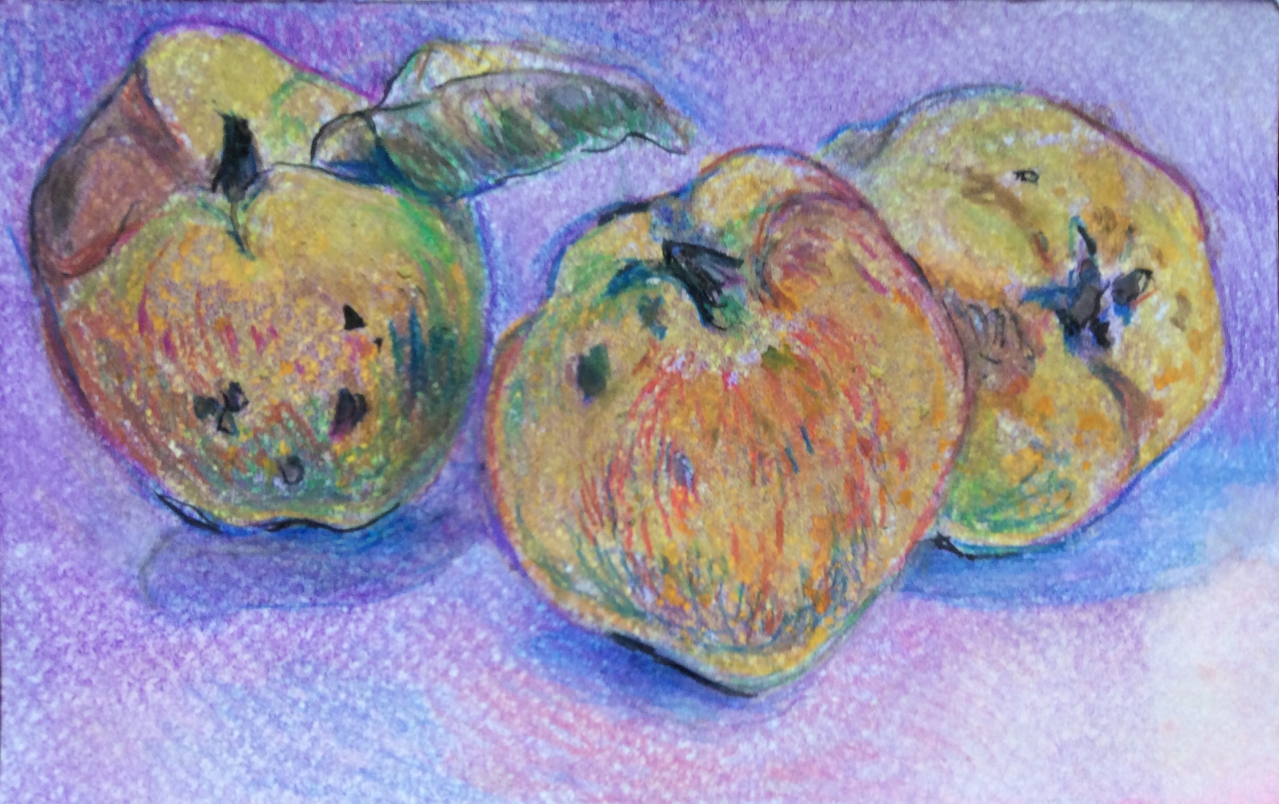 Kweeappels, potlood, aquarel en oliekrijt