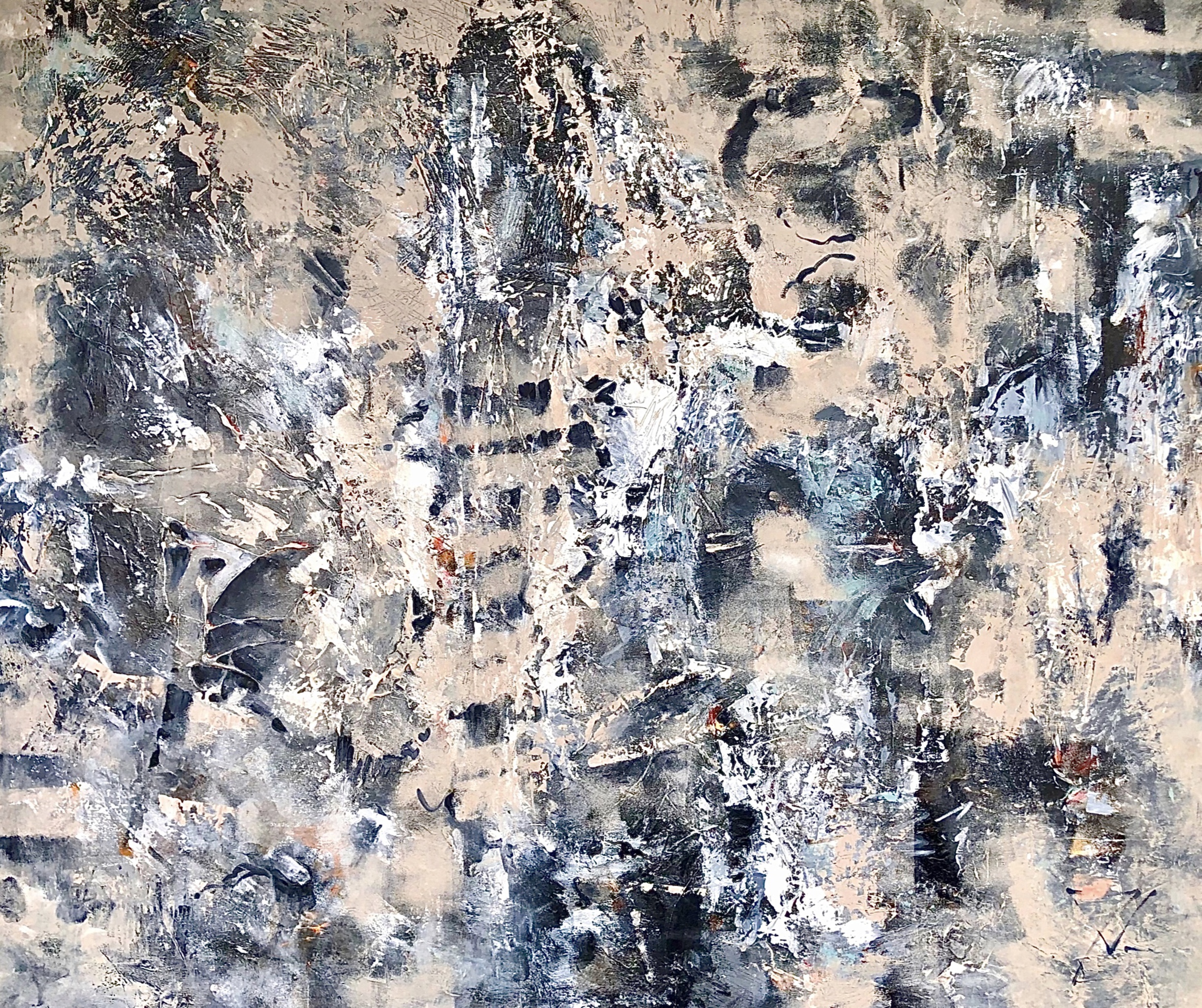 Groot abstract schilderij waarin taupe en blauw samenkomen in een spel van textuur en balans. De gekozen rustige kleuren en de natuurlijke beweging nodigen uit tot verstilling. Zoek en laat je meenemen in het verhaal. Dit abstracte werk biedt ruimte voor eigen interpretatie, reflectie en fantasie – en past zich moeiteloos aan in een modern, sfeervol interieur. Over het werk: gesigneerd · acryl en mixed media op linnen · opgespannen op stevig frame · meegeschilderde zijkanten · klaar om op te hangen Interesse in dit werk? Neem gerust contact op →