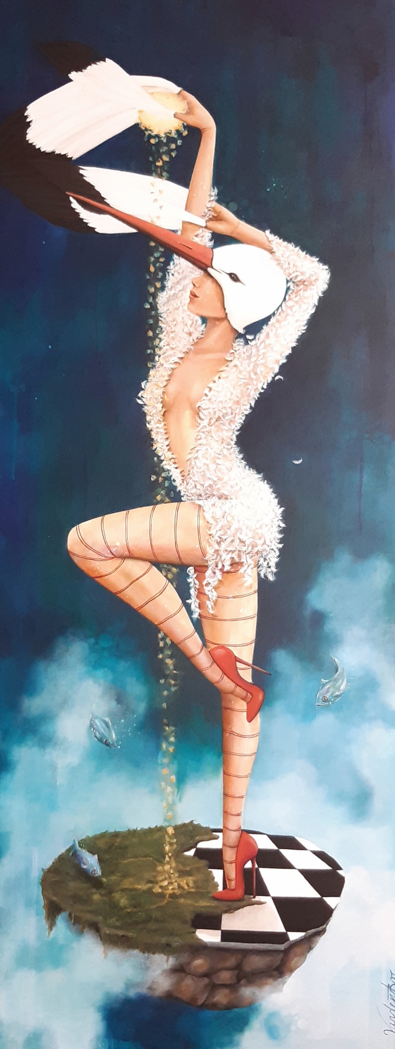 Sold Schilderij van een ooievaarsvrouw die bewust gouden zaden laat vallen. de zaadjes zorgen direct voor groei. Ook de visjes in het schilderij komen hier op af. Vissen symboliseren in mijn werk altijd geluk. Het schilderij vertelt hiermee dat je bewust dingen moet zaaien waarmee je je geluk/vreugde voedt. Zoals bijv. dankbaar zijn voor de ogenschijnlijk kleine dingen of geloven in een mooie toekomst etc. Afmeting: 130 x 50 cm.