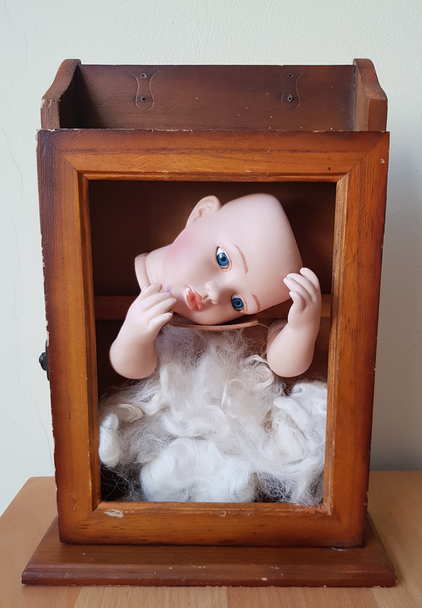 Een houten vitrinekasjte, het glas er uit gehaald. Een porseleinen poppenhoofd dat zich in haar handen laat rusten. Schaapjeswol eronder. Lekker slapen!