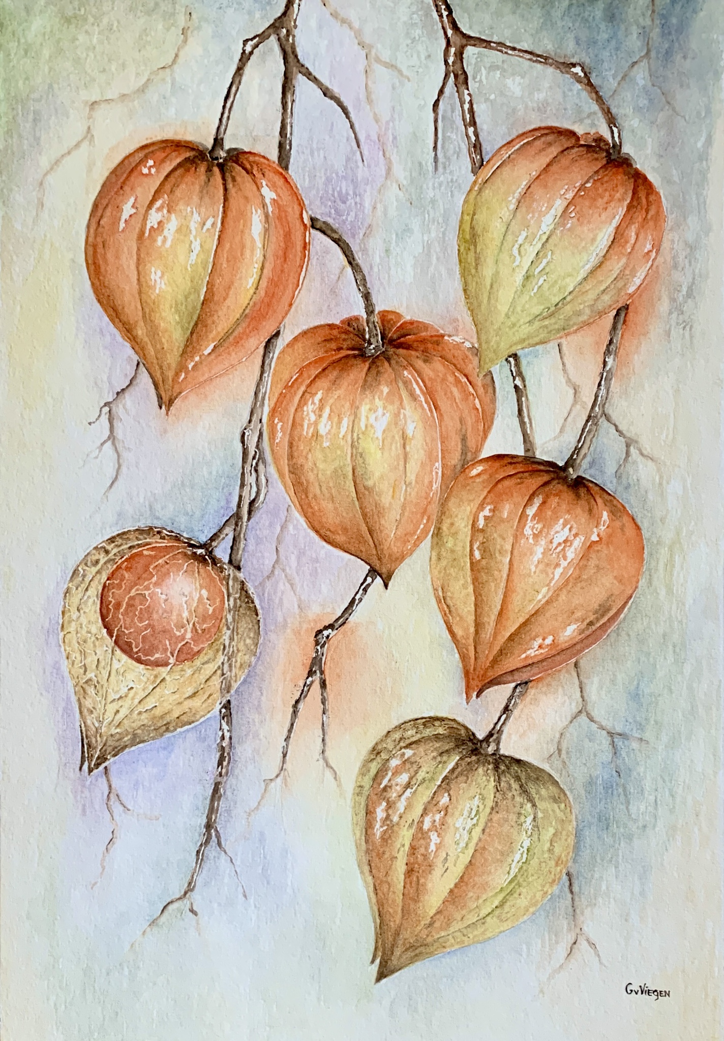 Oranje Bloemen Aquarel Realistisch Natuur Herfst Watercolor Lampion Physalis Lampionplant