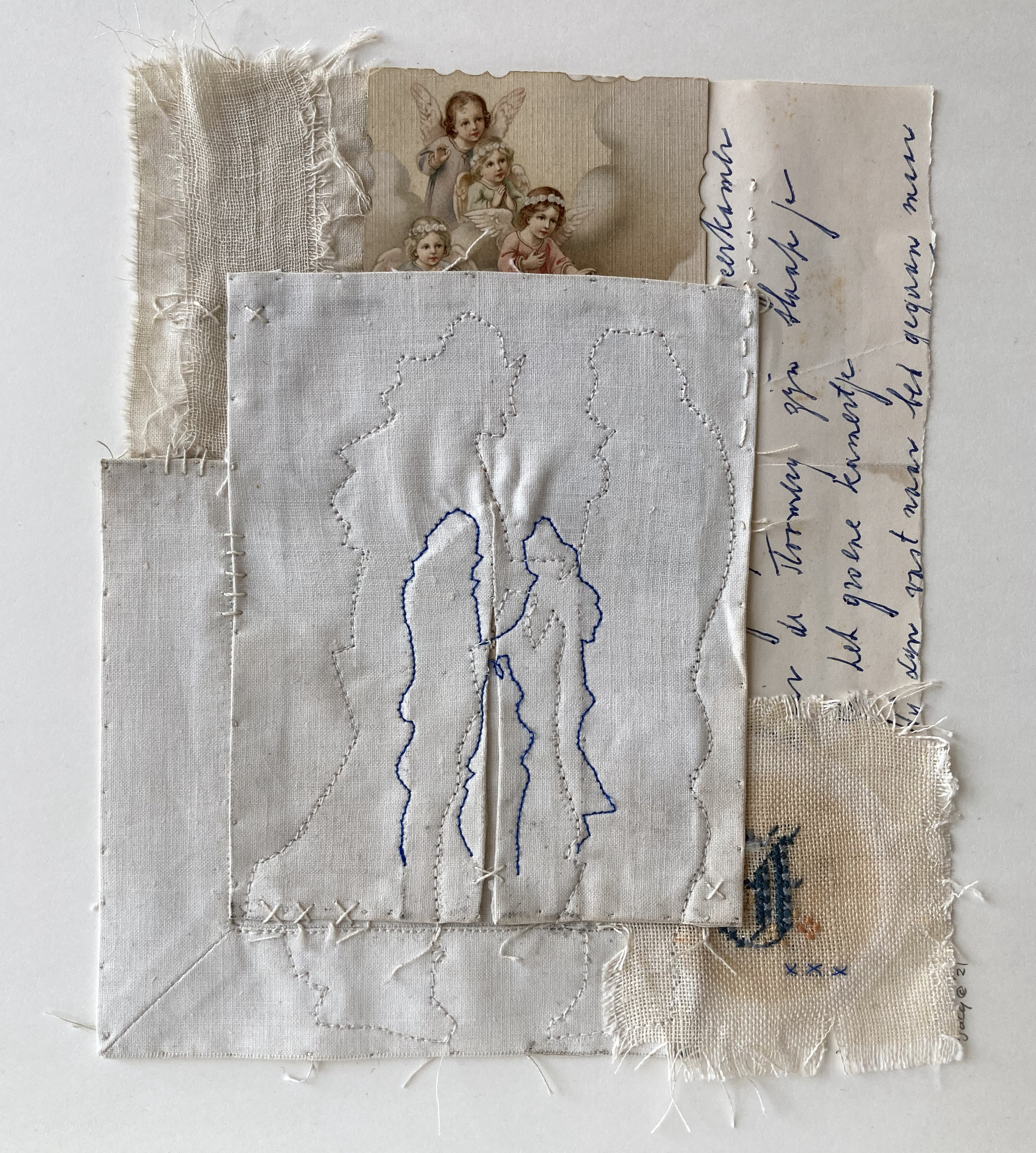 Uit de serie Past Present, met bidprentje, borduurwerk, coupeuse-proefjes, oud handschrift.